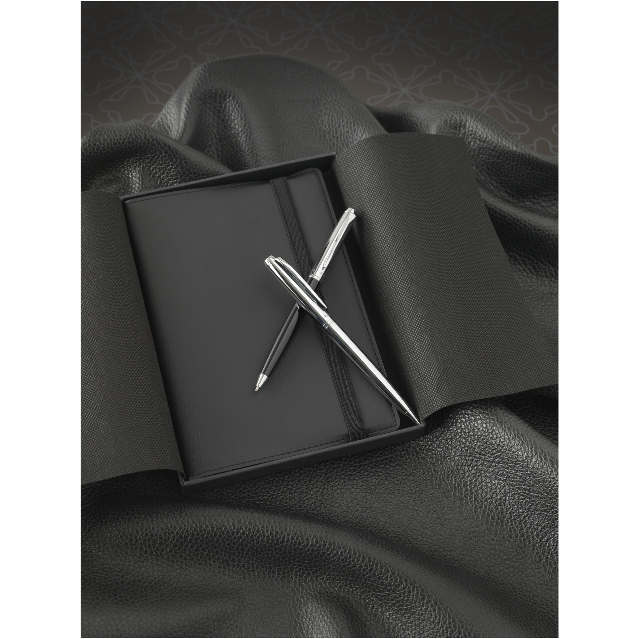 Эксклюзивная шариковая ручка с блестящими хромированными вставками. В набор входит запасной черный стержень премиум-класса. Предлагается в подарочной коробке LUXE (15 x 3,5 x 2 см).