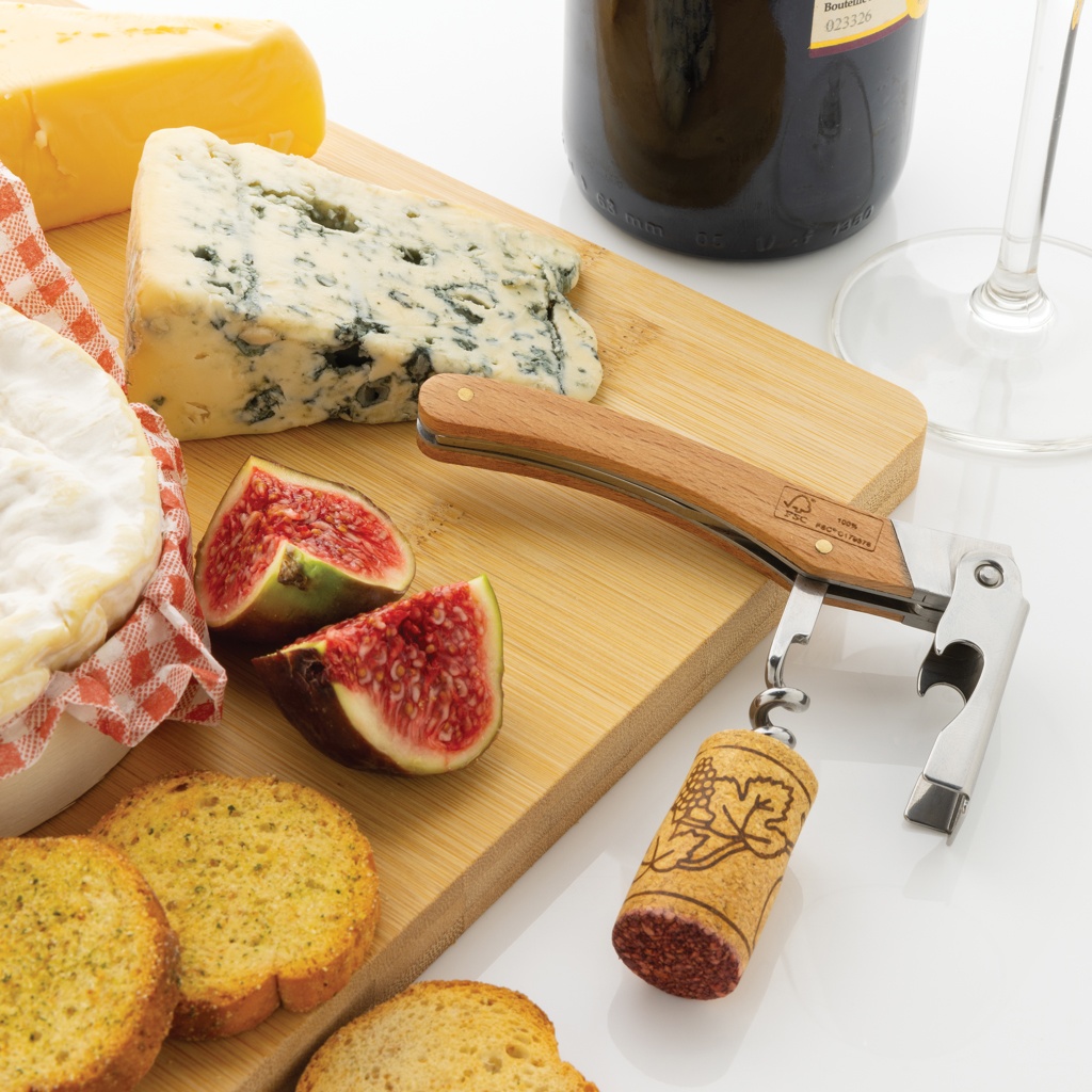 Профессиональный штопор из 100% бука FSC и нержавеющей стали высокой твердости и коррозионной стойкости (420). Твердость по Роквеллу 45-55. Изделие имеет 3 функции: открывалка для бутылок, штопор для пробок и резак для фольги. Упакован в коробку FSC mix kraft.