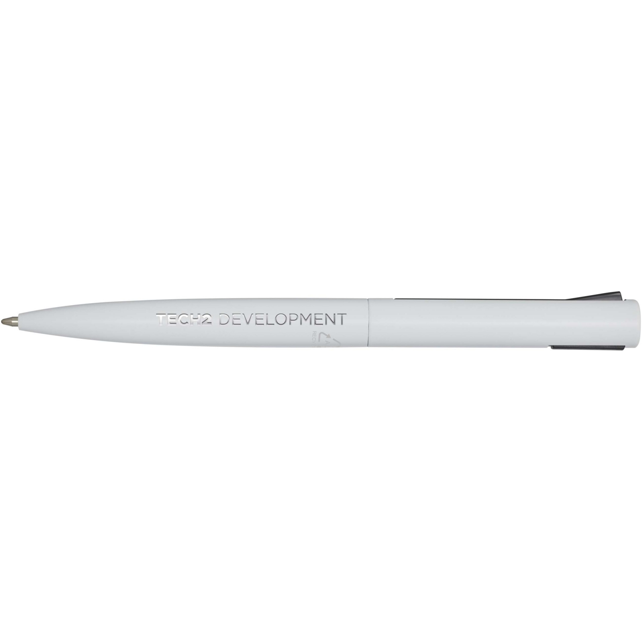 Шариковая ручка, верхняя часть корпуса которой изготовлена из переработанного пластика, а нижняя часть — из переработанного алюминия. Зажим изготовлен из железа. Цвет чернил: синий. Длина непрерывной линии: 1000 метров. Размер пера: 1,0 мм.
