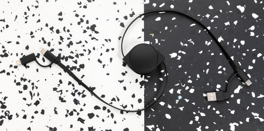 Втягивающийся кабель 6 в 1, где корпус изготовлен из сертифицированного RCS переработанного АБС-пластика, а провод — из переработанного ТПЭ. Общее содержание переработанного материала: 59% от общего веса изделия. RCS (стандарт утверждения о переработке) — это стандарт для проверки содержания переработанного материала в продукте по всей цепочке поставок. RCS — это стандарт, который используется, когда часть изделия изготовлена из переработанных материалов. Кабель имеет 5 различных разъемов: вход USB C, вход USB A, выход типа C, выход IOS и выход micro USB. Это позволяет использовать кабель с выходными устройствами типа C, которые включены в новое поколение телефонов и компьютеров MacBook. Кабель также имеет опцию выхода USB A, поэтому он может заряжать любое устройство от любого источника выходного сигнала. Изделие полностью не содержит ПВХ.