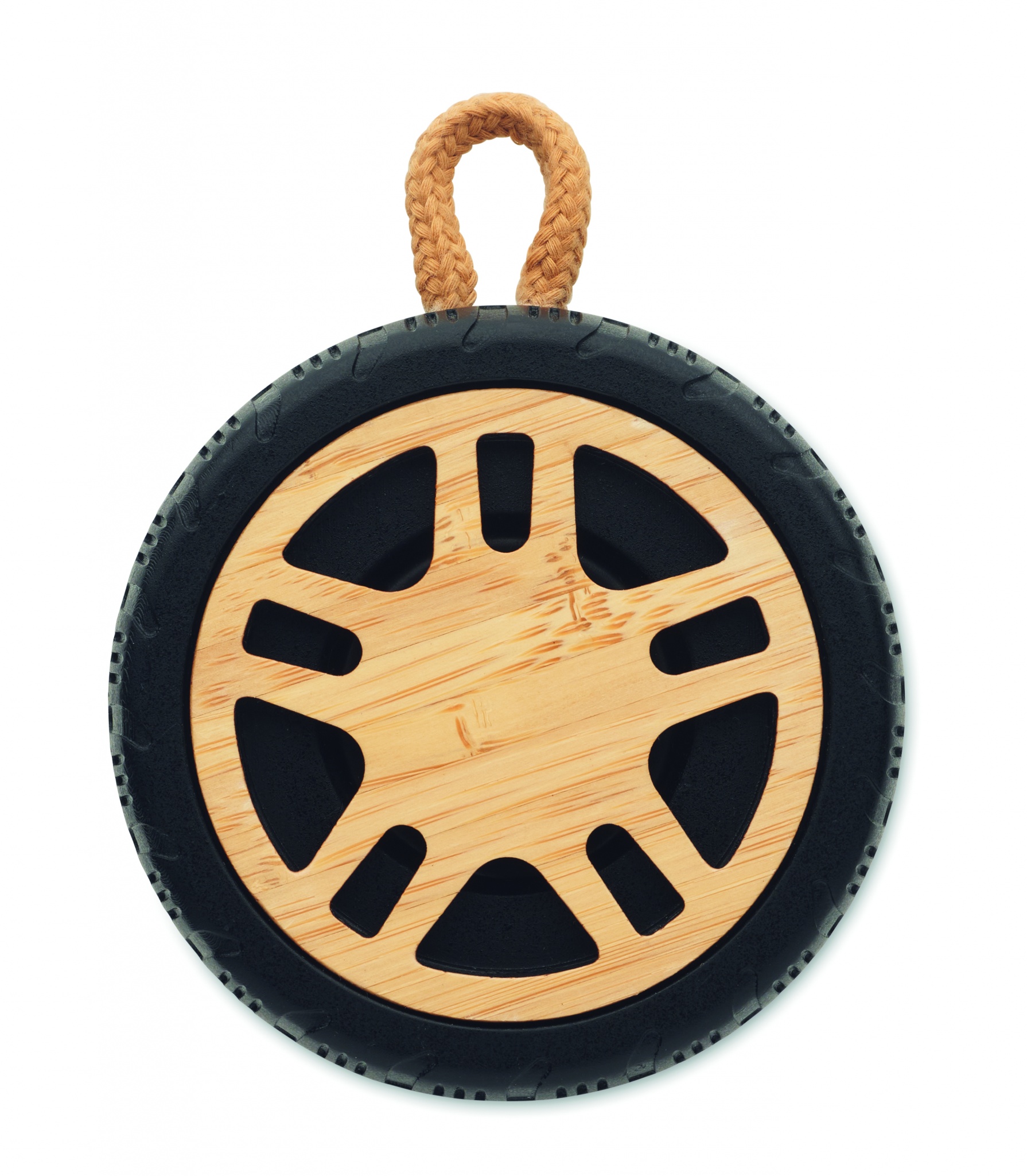 Беспроводная колонка 5.3 в форме шины из переработанного пластика с бамбуковыми деталями и ручкой из хлопка. Аккумулятор емкостью 400 мАч.