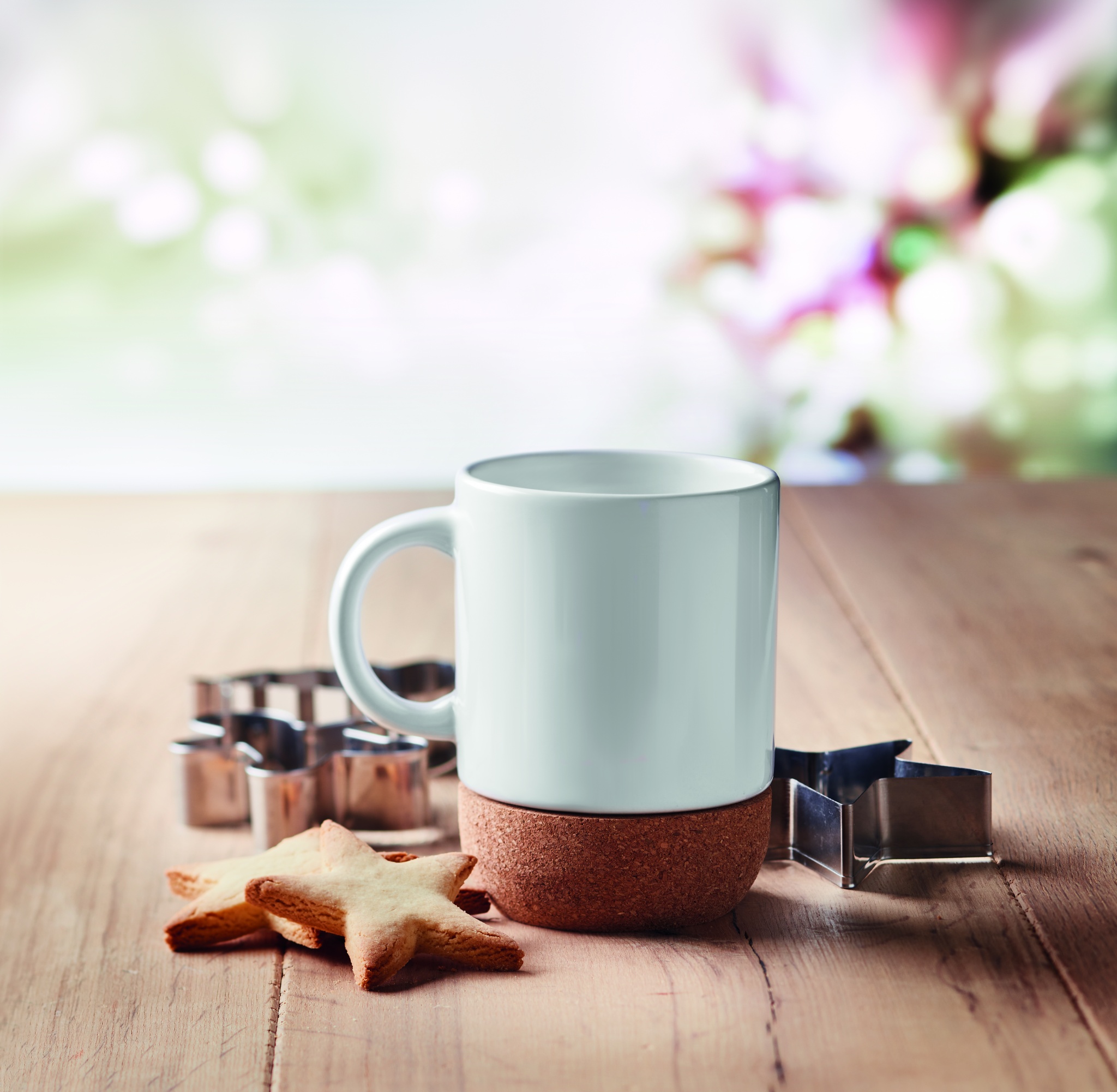 Керамическая кружка со специальным покрытием для сублимационной печати и пробковым основанием. Индивидуальная упаковка в картонную коробку белого цвета. Емкость: 300 мл