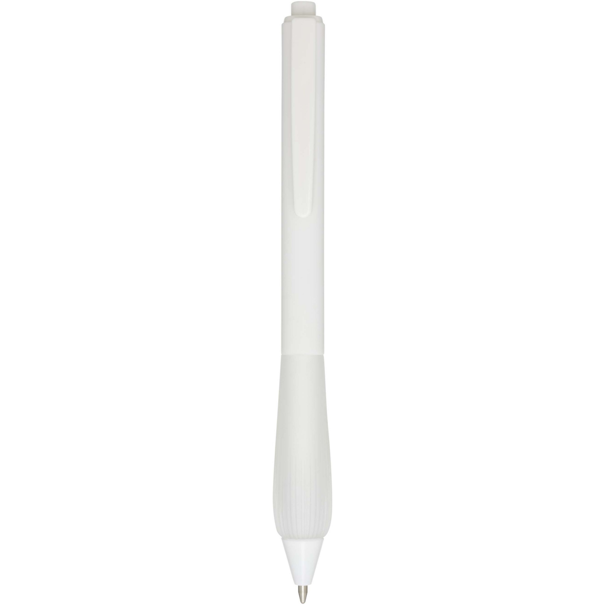 Шариковая ручка из переработанного пластика с прорезиненным корпусом и рукояткой из TPR. Цвет чернил: синий. Длина непрерывной линии: 1000 метров. Размер пера: 1,0 мм.