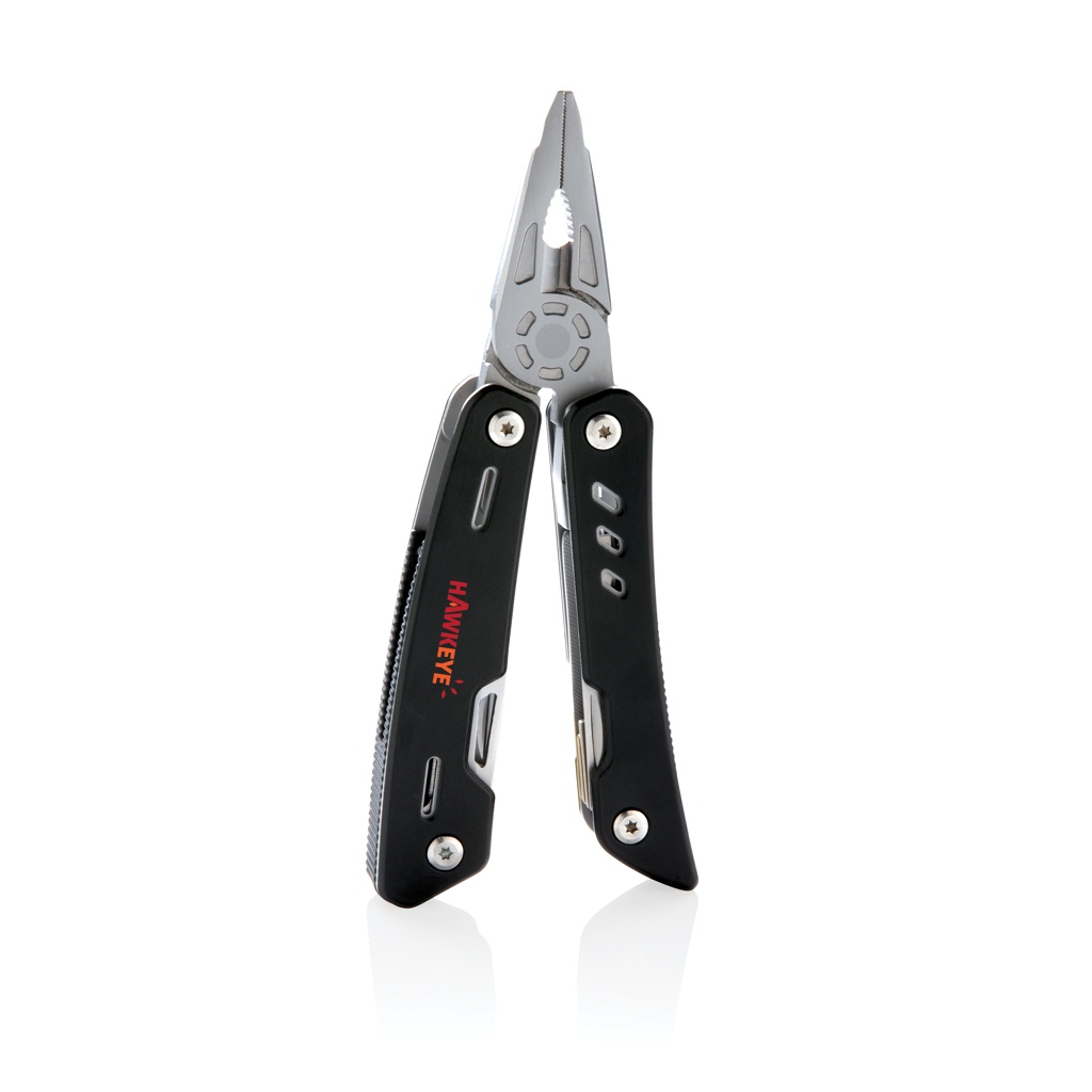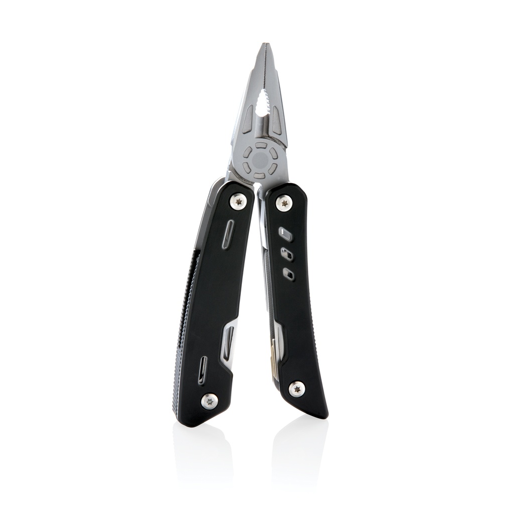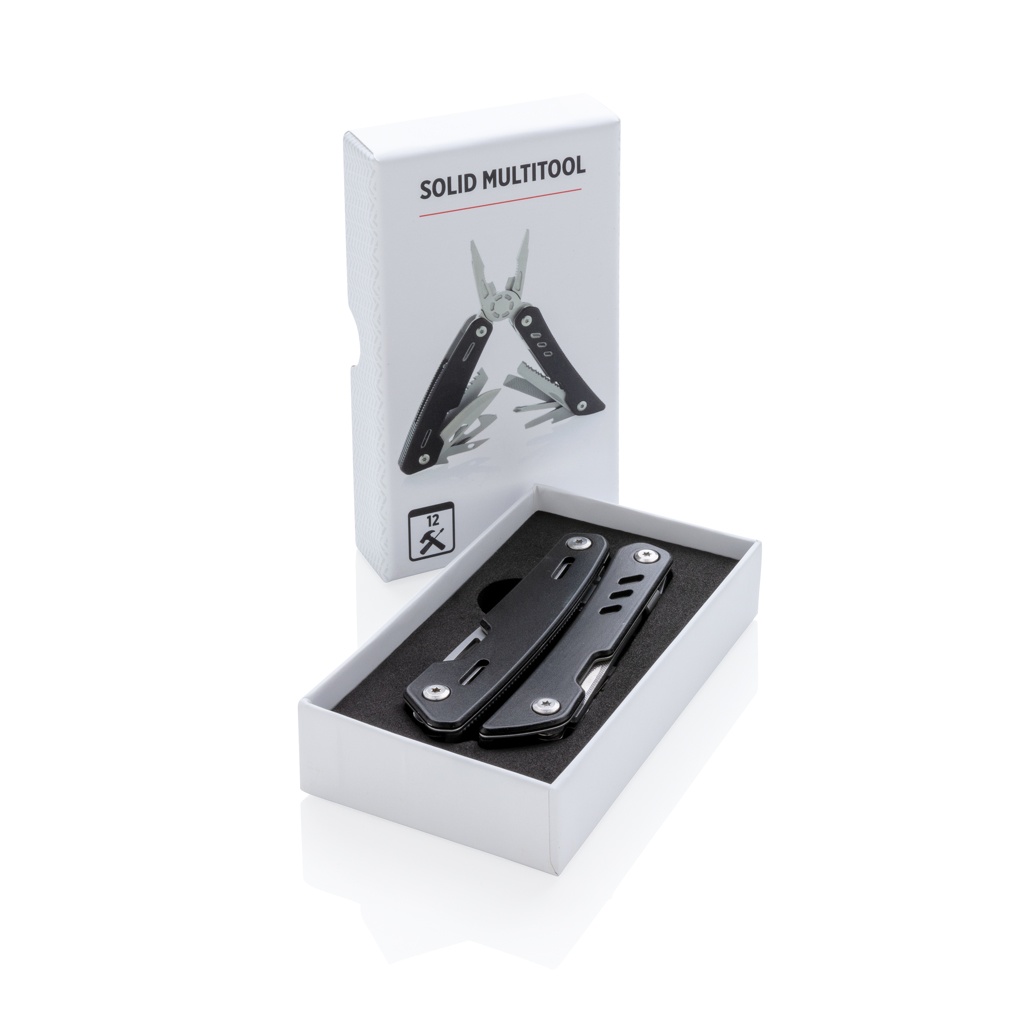 Прочный и долговечный многофункциональный инструмент с 12 функциями. С алюминиевым корпусом и инструментами из нержавеющей стали. В набор входят: плоскогубцы с острыми носами, обычные плоскогубцы, кусачки, нож, крестовая отвертка, малая плоская отвертка, пила, консервный нож, открывалка для бутылок, зубчатый нож, развертка/пробойник, напильник и большая плоская отвертка. Упакован в подарочную коробку.