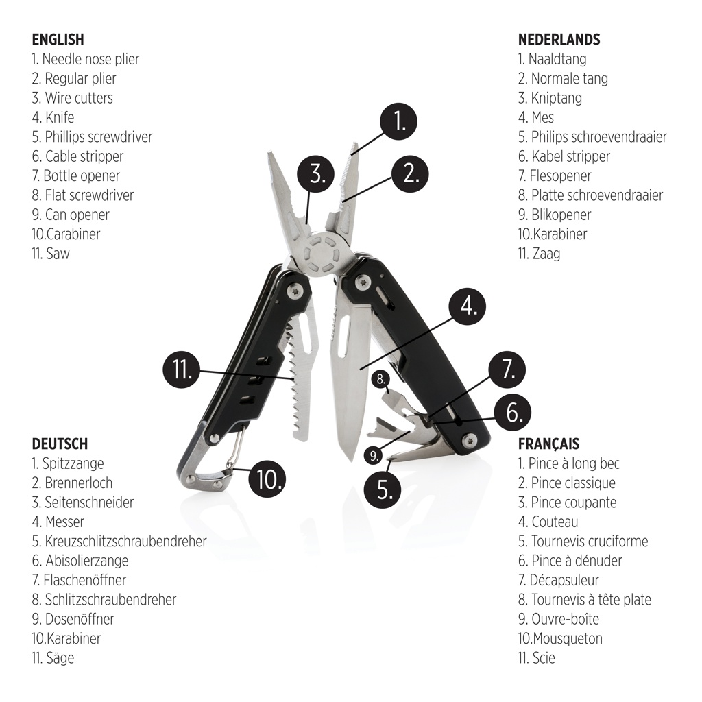 Прочный и долговечный многофункциональный инструмент с 11 функциями. С алюминиевым корпусом и инструментами из нержавеющей стали. В набор входят: плоскогубцы с острыми носами, обычные плоскогубцы, кусачки, нож, крестовая отвертка, плоская отвертка, пила, консервный нож, открывалка для бутылок, инструмент для зачистки проводов, карабин. Упакован в подарочную коробку.