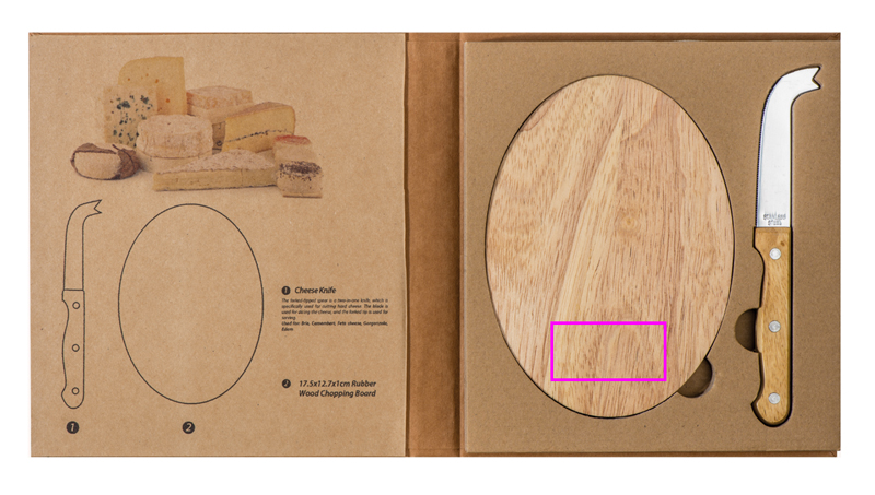 Сырный набор, включающий круглую деревянную доску и нож для сыра из нержавеющей стали, который также можно использовать для подачи. На доске будет выгравирован ваш логотип.