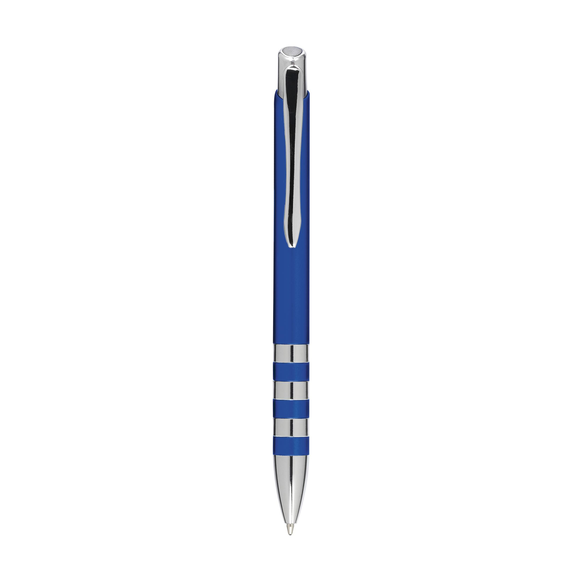 Шариковая ручка с синими чернилами, металлическим корпусом, металлическим зажимом, кнопкой и блестящими кольцами корпуса.