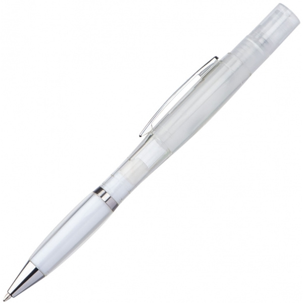 Прозрачная ручка Twistpen с серебряными аппликациями и синим стержнем. Распылитель можно заправлять — идеально подходит для парфюмерии или дезинфицирующих жидкостей. Мы напечатаем ваш логотип на правой стороне зажима.