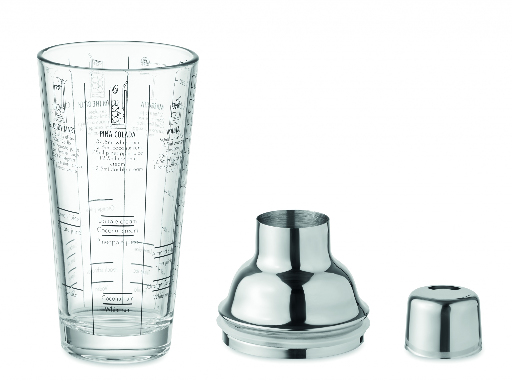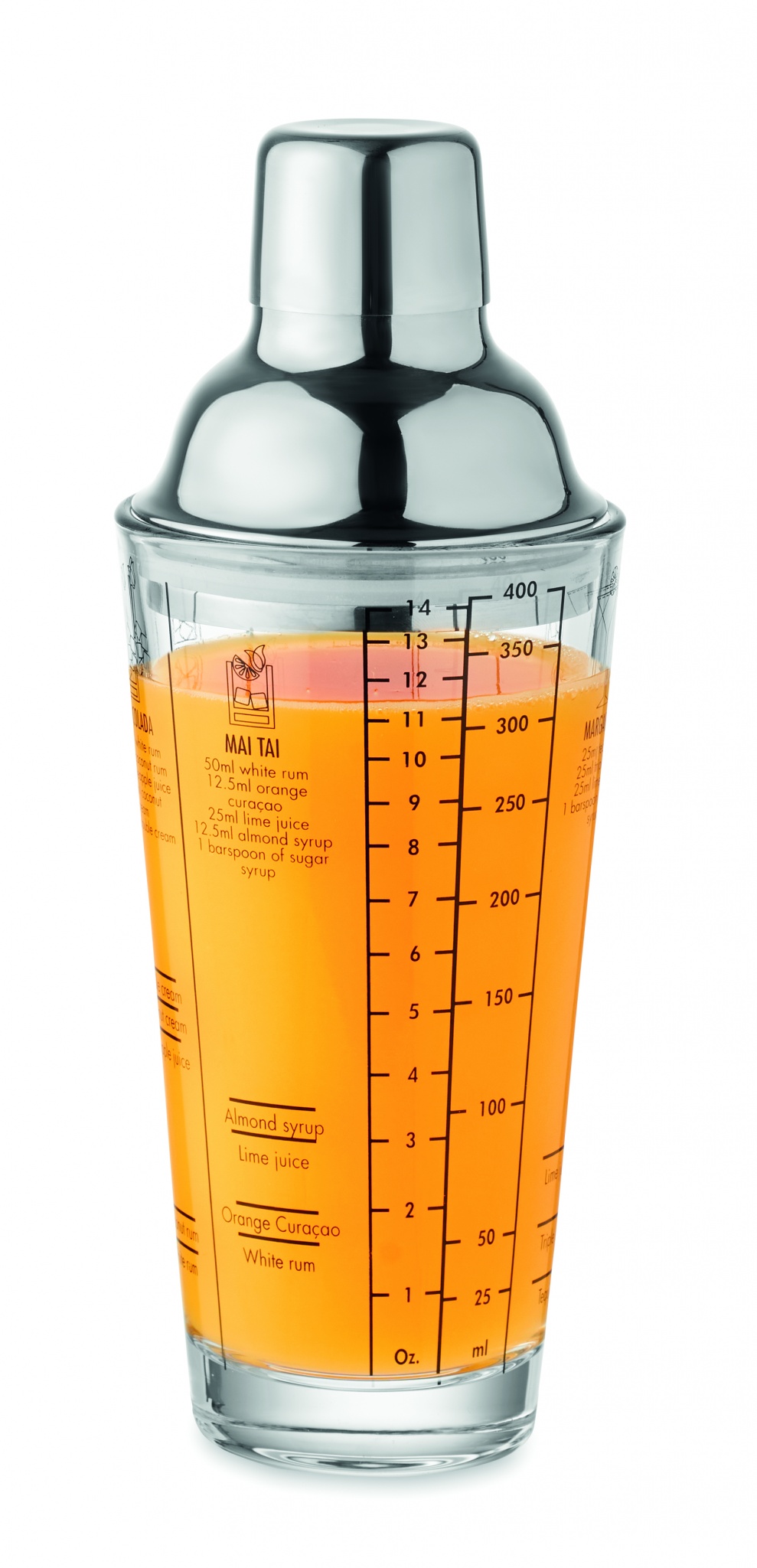 Стеклянный шейкер для коктейлей с крышкой из нержавеющей стали и ситечком. Печатные рецепты коктейлей и мерки на стакане. Емкость: 400 мл.
