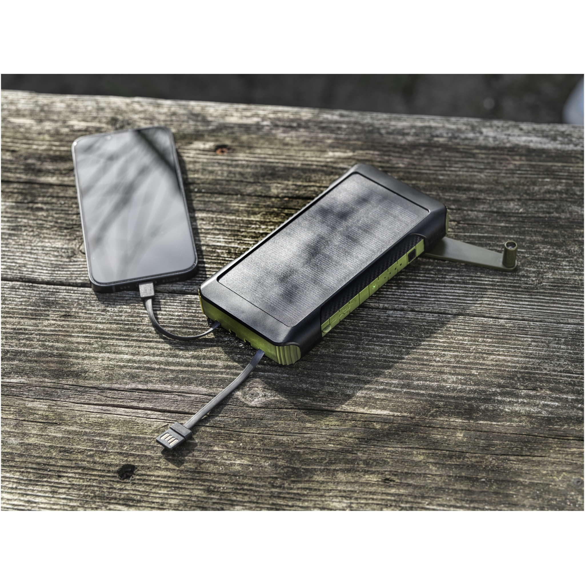 Портативное зарядное устройство на солнечной батарее Soldy емкостью 10 000 мАч из переработанной пластмассы RCS является идеальным зарядным устройством для активного отдыха. Оно оснащено ручной динамо-машиной для выработки электроэнергии вручную на случай, если у вас закончится электричество и нет солнечного света. Портативное зарядное устройство также можно заряжать через порт Type-C или micro USB на устройстве. Благодаря встроенным зарядным кабелям с разъемами Type-C, iOS, USB-A и micro USB данное портативное зарядное устройство позволяет заряжать большинство смартфонов, камер, блоков питания, наушников и т. д. Портативное зарядное устройство имеет максимальную выходную мощность 2,4 А на порт. Входная мощность ограничена до 2 А. Поставляется с руководством пользователя и зарядным кабелем USB-A на Type-C длиной 30 см. Упаковано в коробку из 100% крафт-бумаги вторичной переработки.