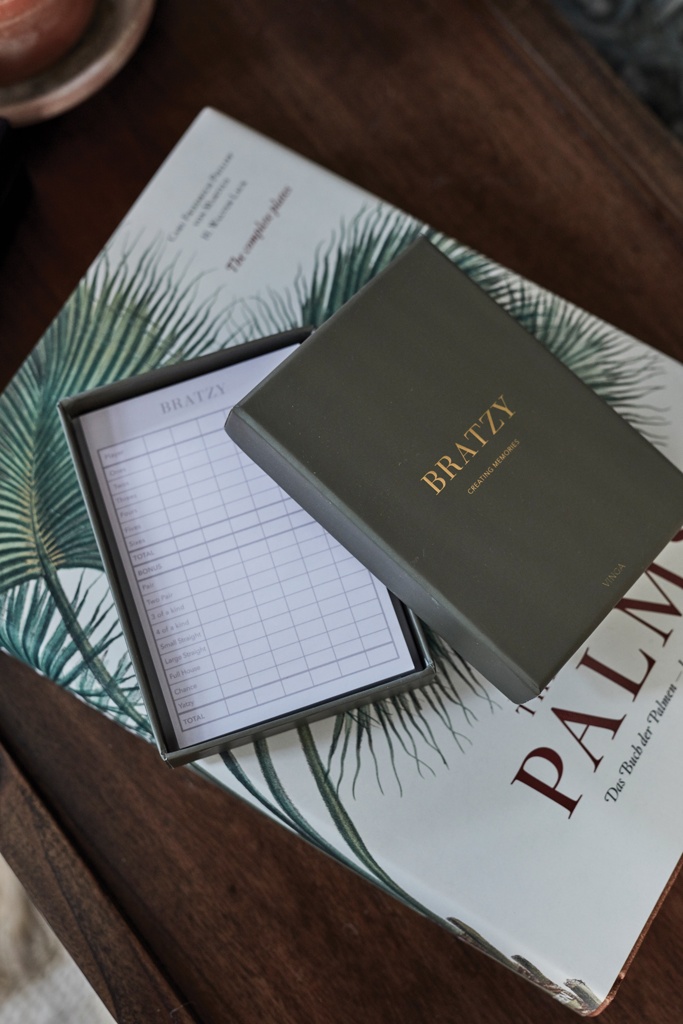 Это Yatzy в роскошной упаковке! С золотыми кубиками и столь же эксклюзивным карандашом мы превращаем Yatzy в Bratzy. Эта игра поставляется в стильной коробке с золотым текстом, напечатанным на ней, что делает ее и забавной для дарения, и приятной деталью на журнальном столике.