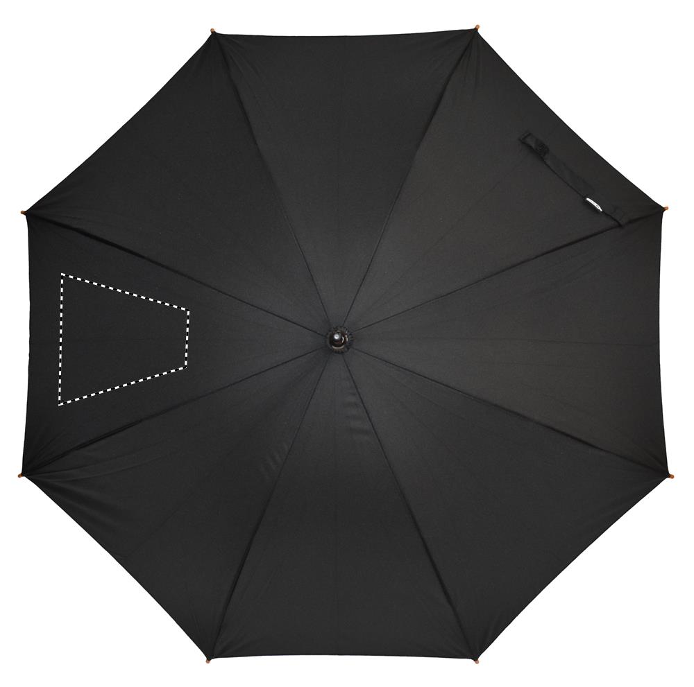 Promenadparaply, 23 tum. Med automatisk öppning. Exklusivt Pongee material i 190T återvunnen RPET. Skaft, sprötspetsar och topp i trämaterial. Svartpläterade metallribbor. Böjt naturligt trähandtag. Manuell stängning.