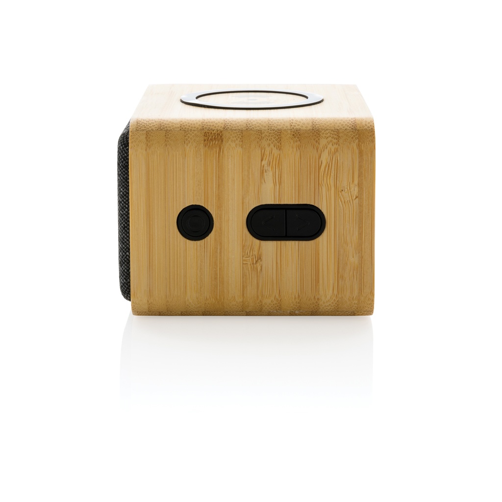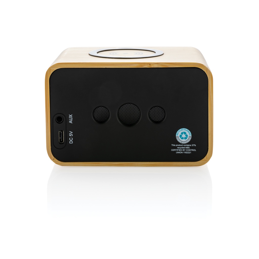 3W trådlös högtalare med integrerad 5W trådlös laddare på toppen. Hölje i FSC® 100% bambu, RCS (Recycled Claim Standard) certifierad återvunnen ABS och PET. Totalt återvunnet innehåll: 37% baserat på total produktvikt. RCS certifiering säkerställer en helt certifierad leveranskedja av de återvunna materialen. Högtalarens batteri på 1200 mAh ger en speltid på upp till 5 timmar. BT 5.0 för smidig anslutning och klart ljud, räckvidd upp till 10 meter. Med mikrofon för att besvara inkommande samtal. Levereras i FSC mix kraft förpackning. 100cm laddningskabel i GRS certifierad TPE medföljer. Produkt och accessoarer är 100% PVC-fria.