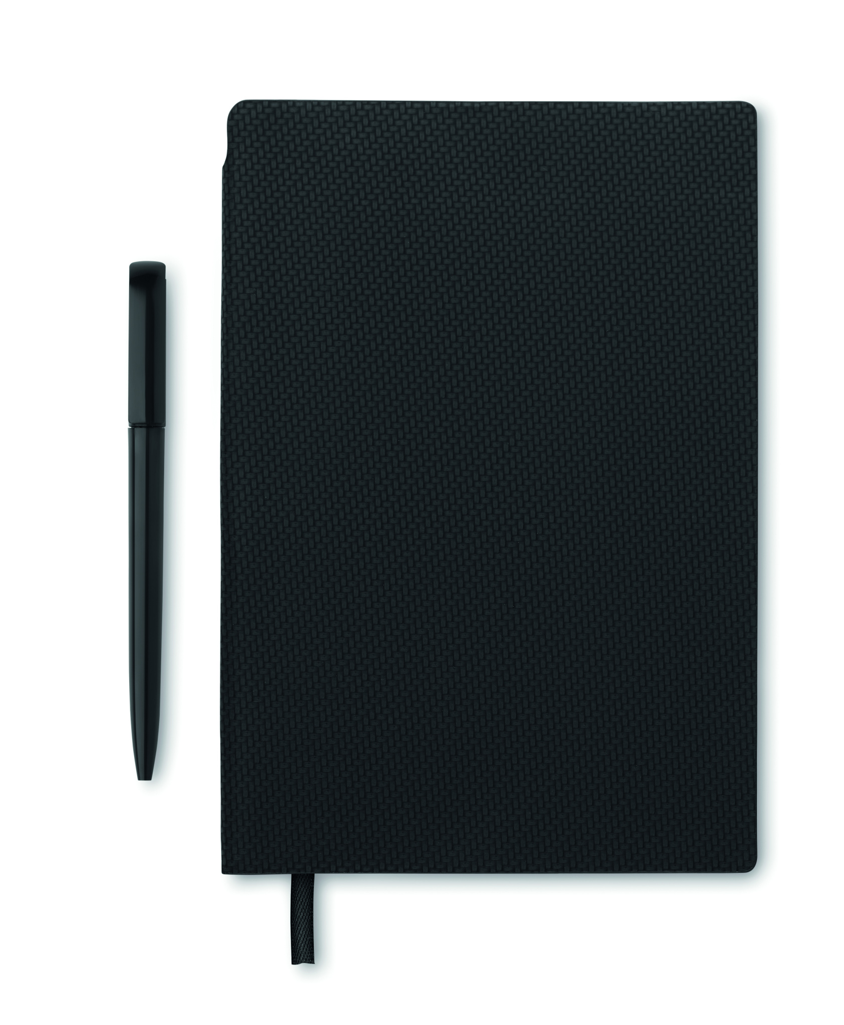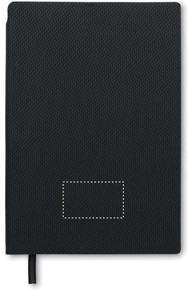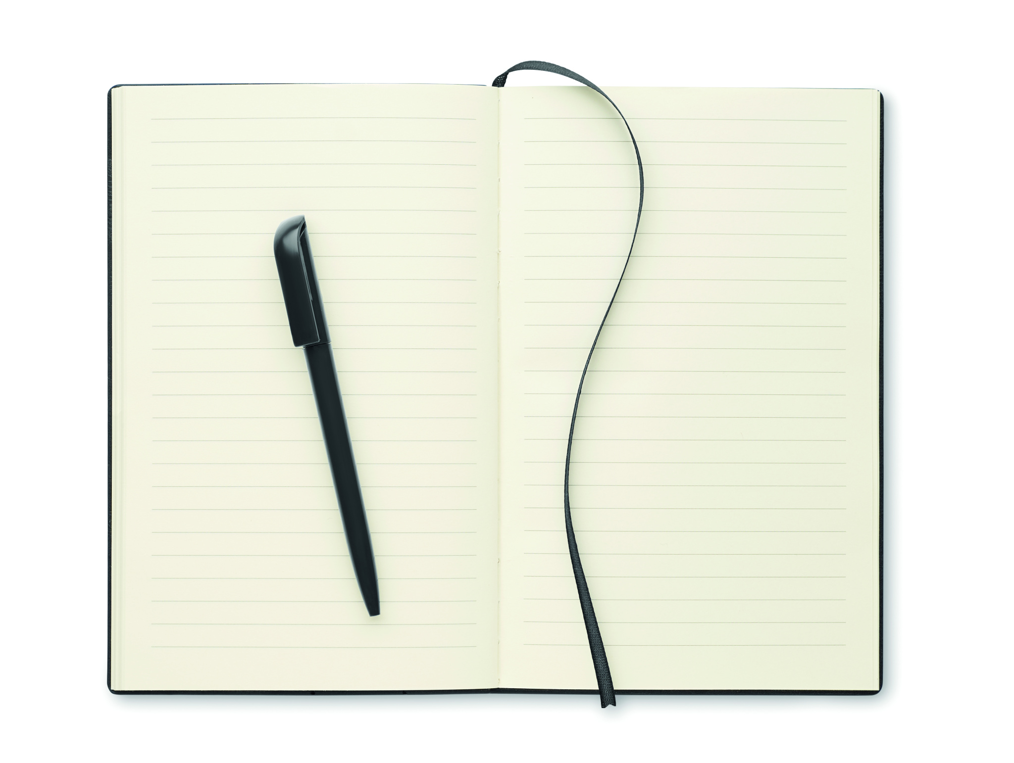 A5 anteckningsbok med PU-omslag och ABS twist-kulspetspenna i pennhållaren på ryggen. Inbunden. 160 linjerade sidor av återvunnet papper (80 ark).