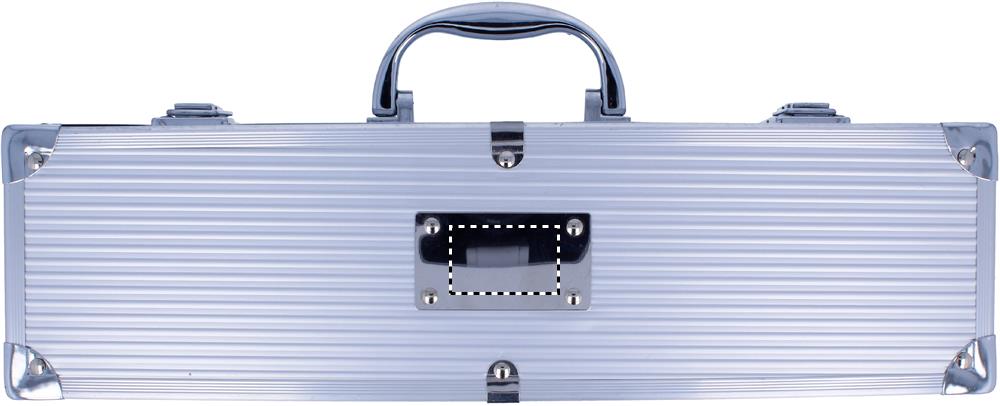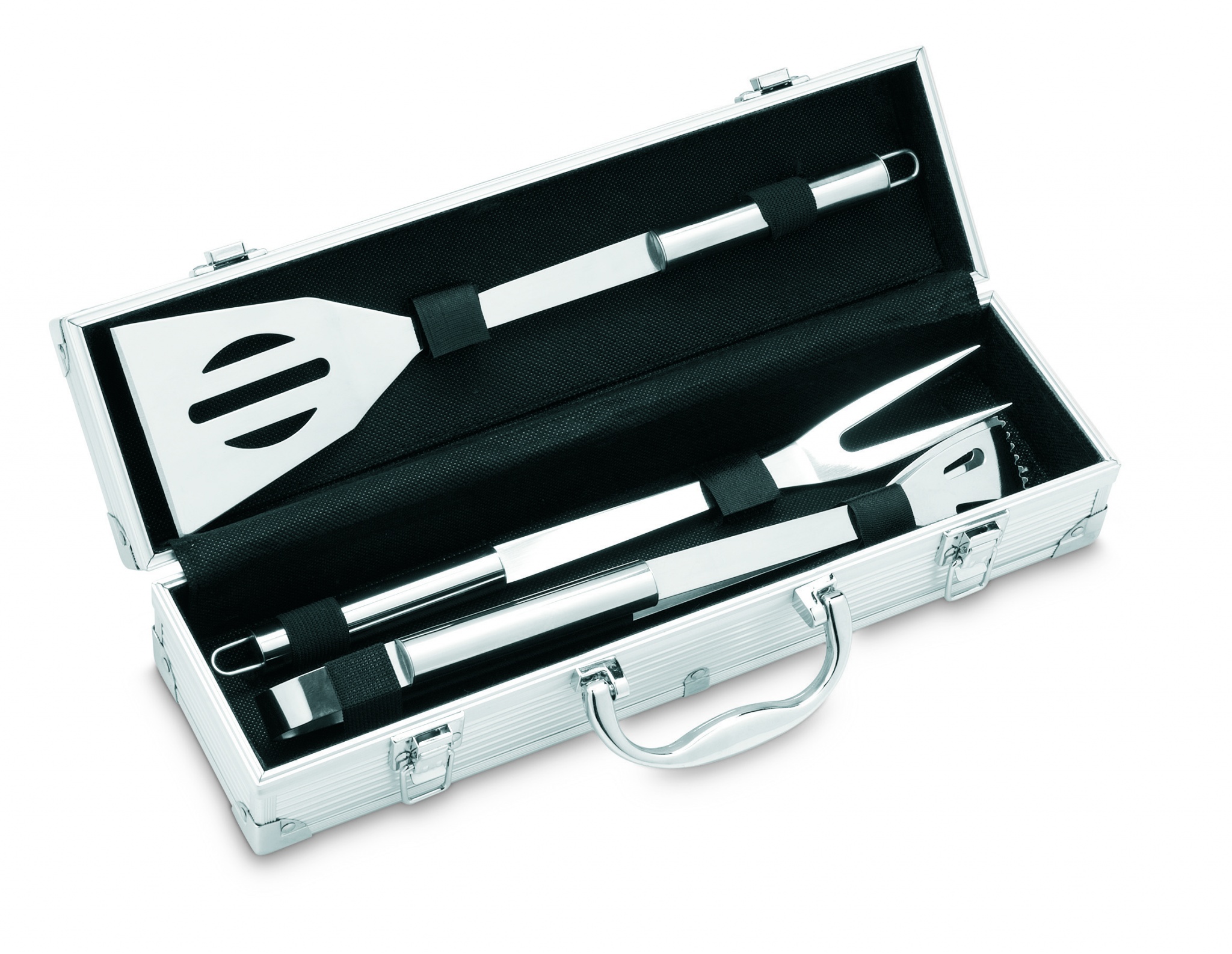 Aluminium väska med 3 olika grillredskap i rostfritt stål. Tranchergaffel, grillspade och grilltång. Metallbricka utvändigt på väskan för märkning av ditt budskap.