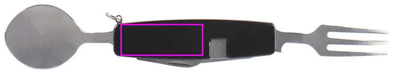 Tvådelad campingbestick av rostfritt stål. Den kan delas på mitten så att du får kniv och gaffel, eller flasköppnare och sked. Vi graverar din logotyp på ena sidan.