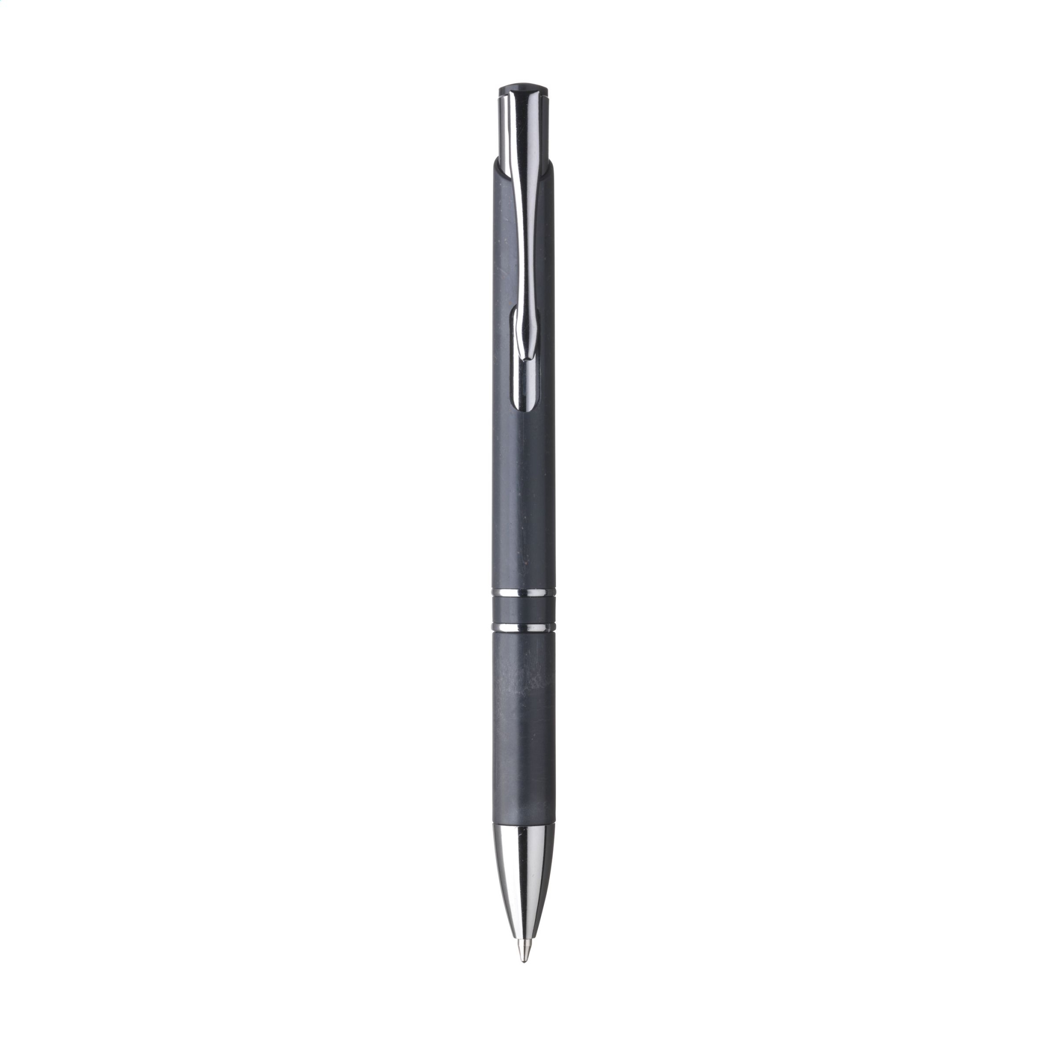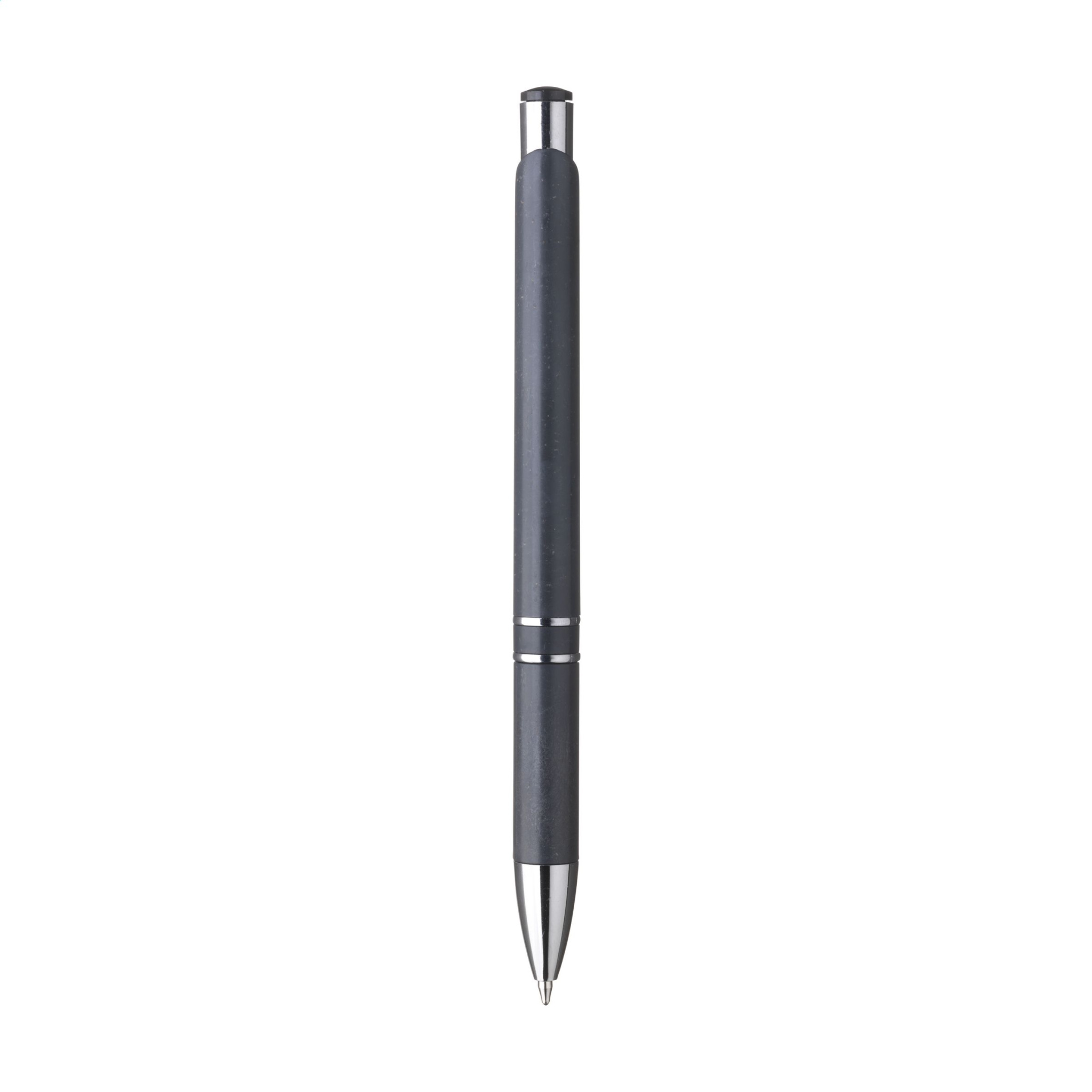 Kulspetspenna med blått bläck med en cylinder gjord av 50 % ABS och 50 % vetehalm, metallklämma och kromdetaljer i plast.