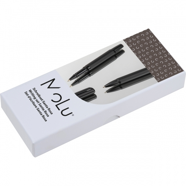 Högkvalitativt skrivset bestående av en rollerball och en vridkulspetspenna, båda med blåskrivande refill i elegant design. Förstärkt med MoLu-logotypen, mattsvart tryckt på den svarta ringen. Perfekt för stilfullt skrivande och en exklusiv present!