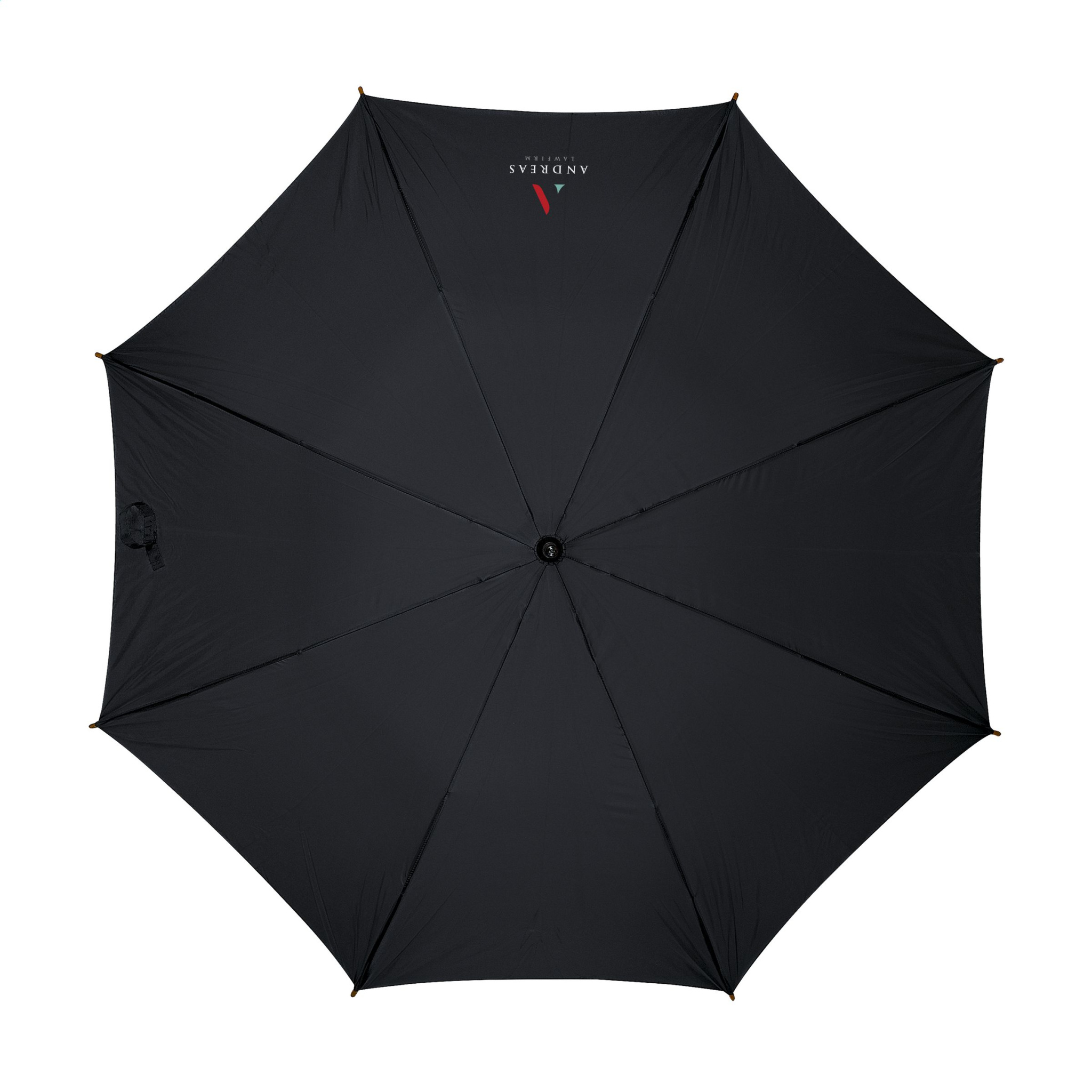 Paraply med automatisk teleskopöppning, 190T polyesterkapell, metallram, träskaft och handtag samt kardborrefäste.