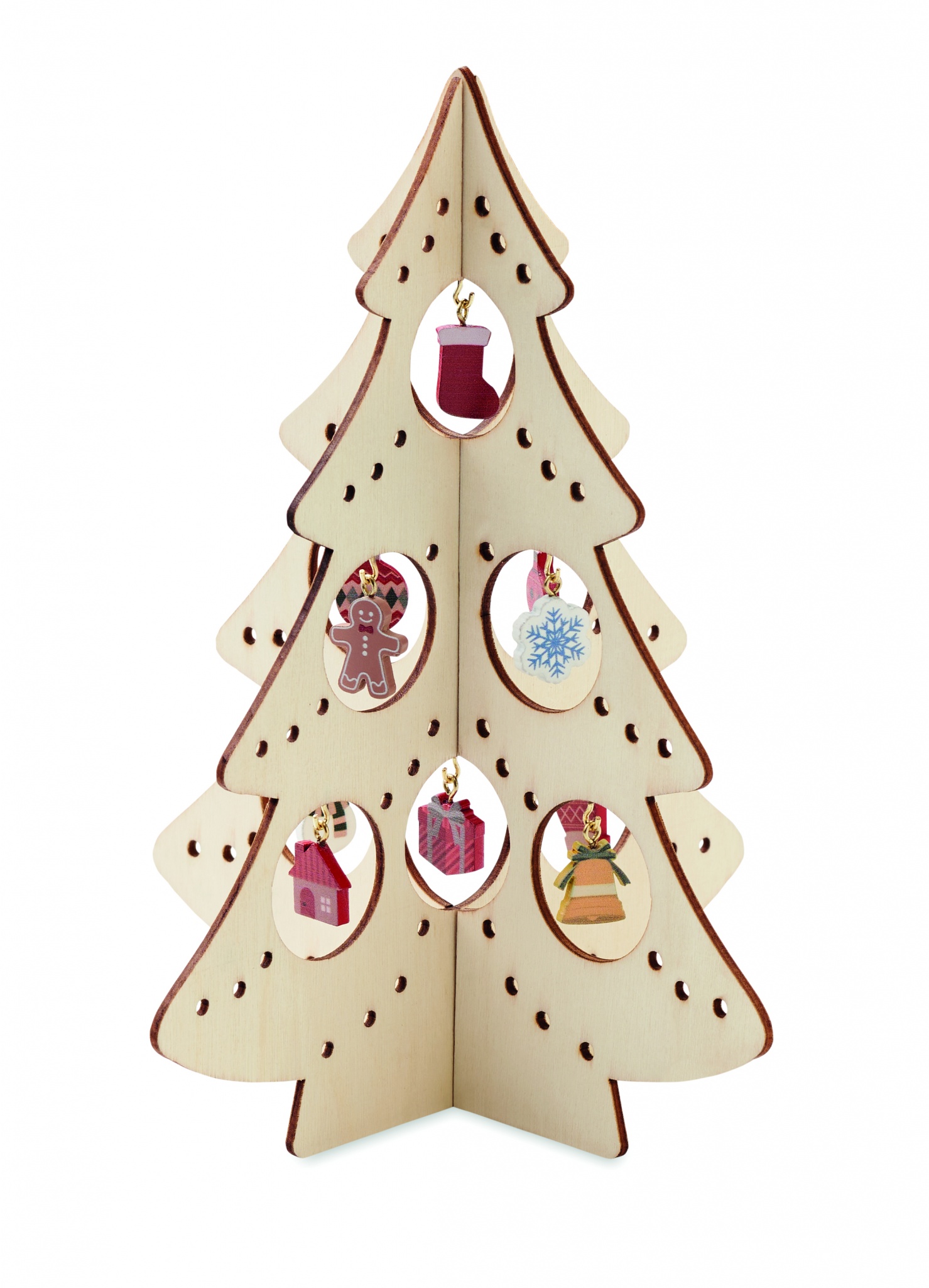 Julgran i plywoodsilhuett med 10 olika ornament. Montering krävs.