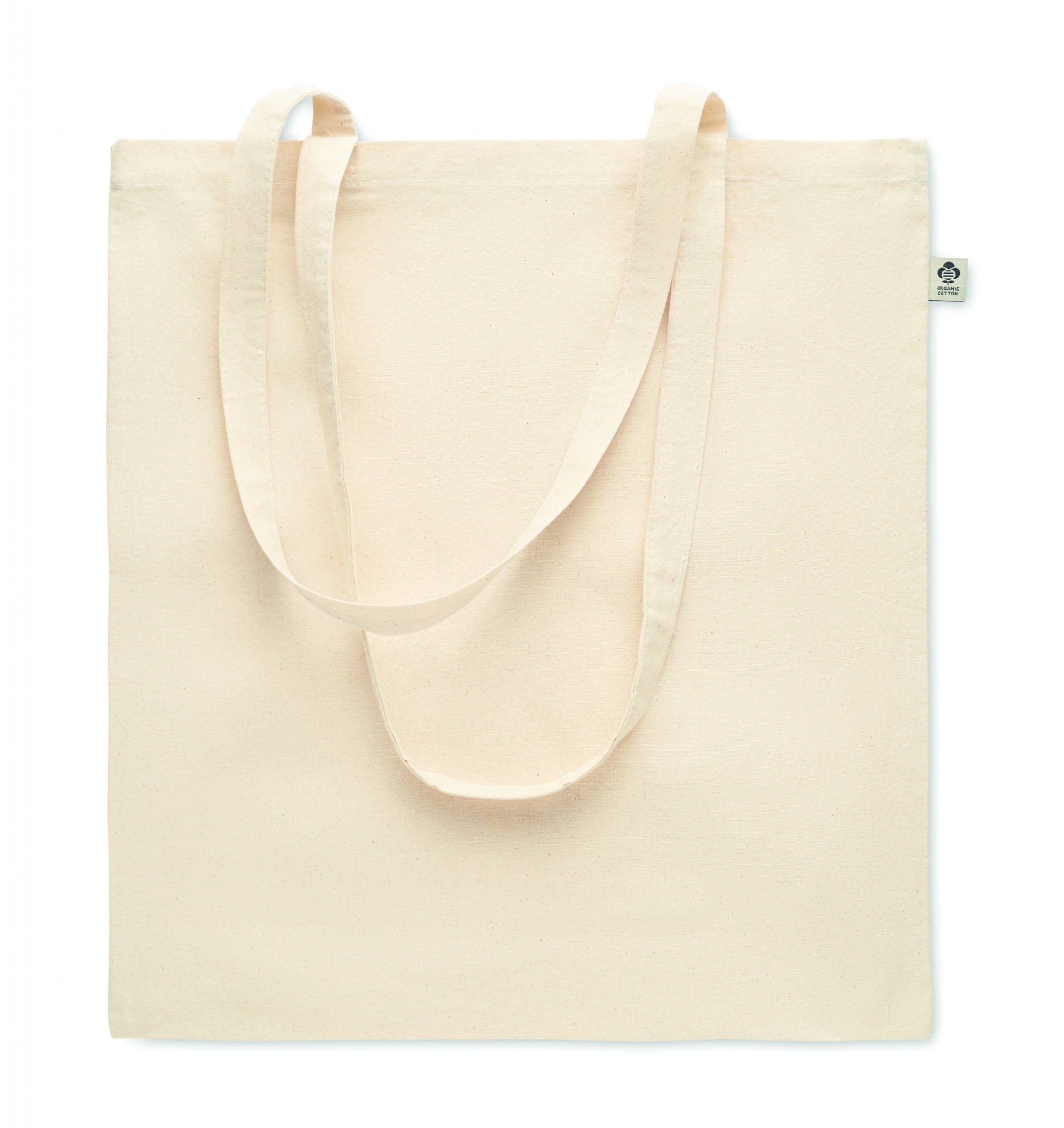 Kasse i ekologisk bomull med långa handtag. 180 gr/m².