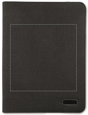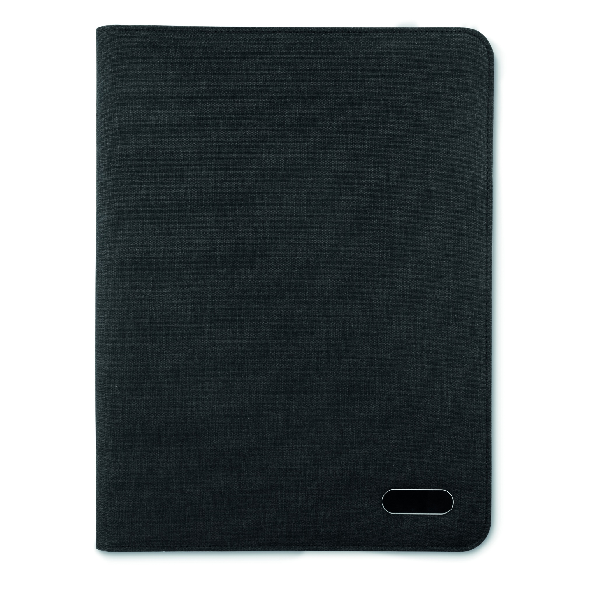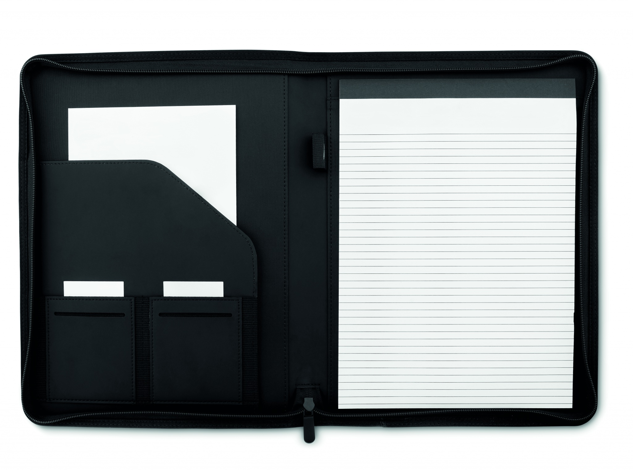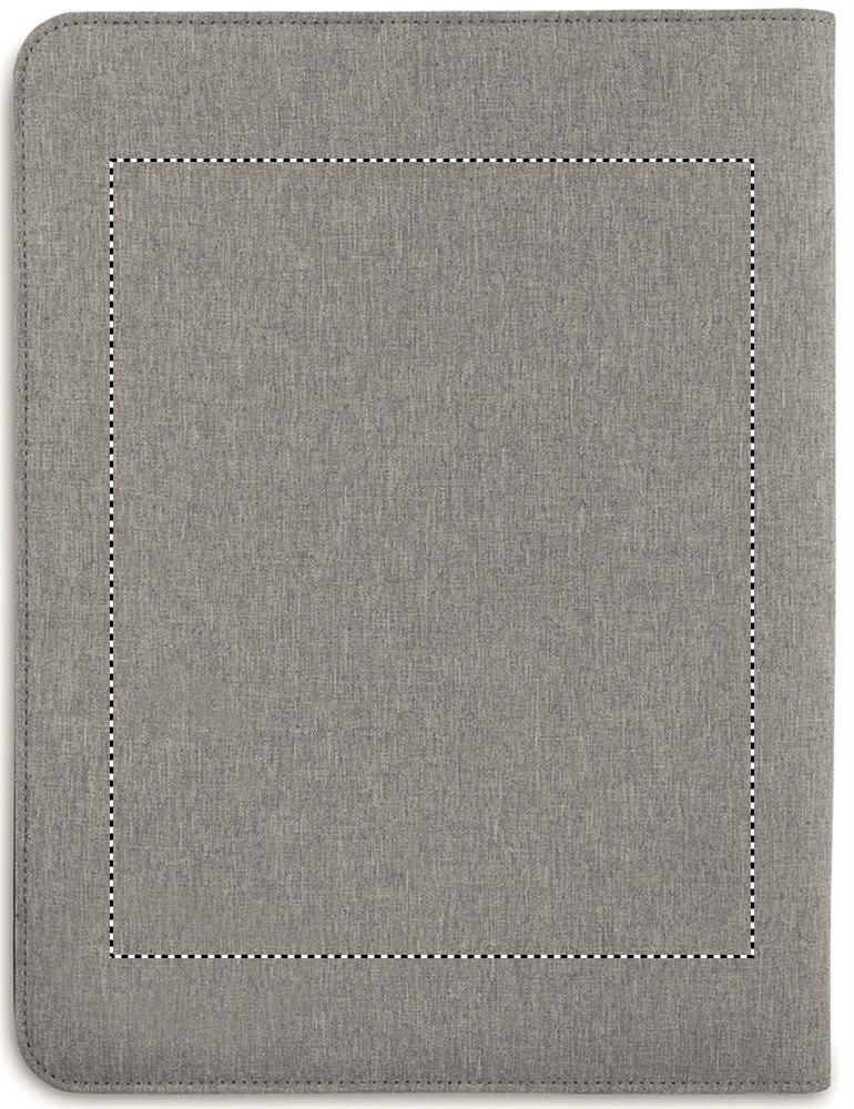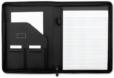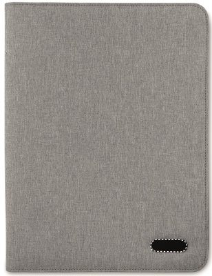 Konferensmapp A4-storlek i tvåtons polyester. Flera praktiska fack för visitkort, dokument och penna. 20-sidigt linjerat anteckningsblock ingår.