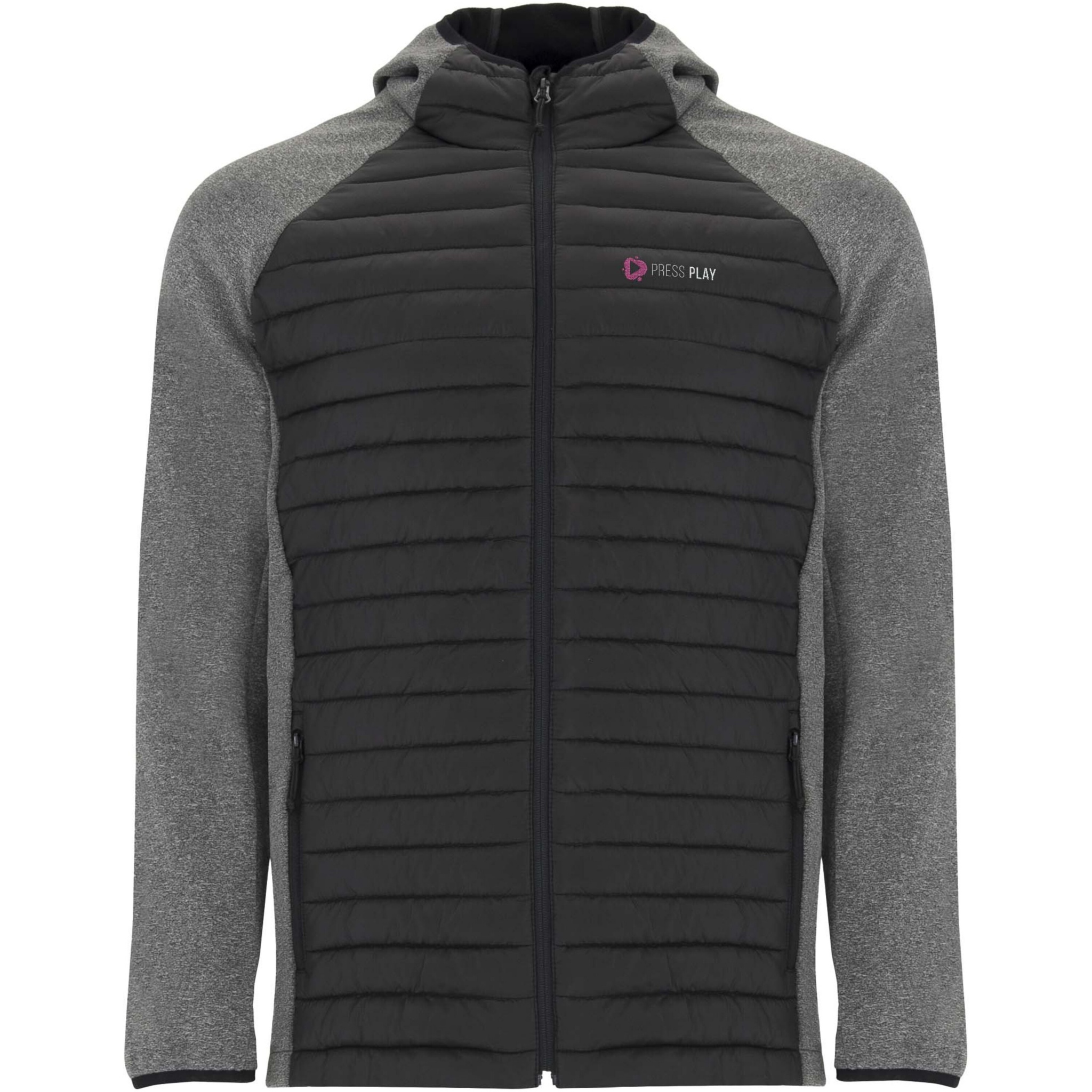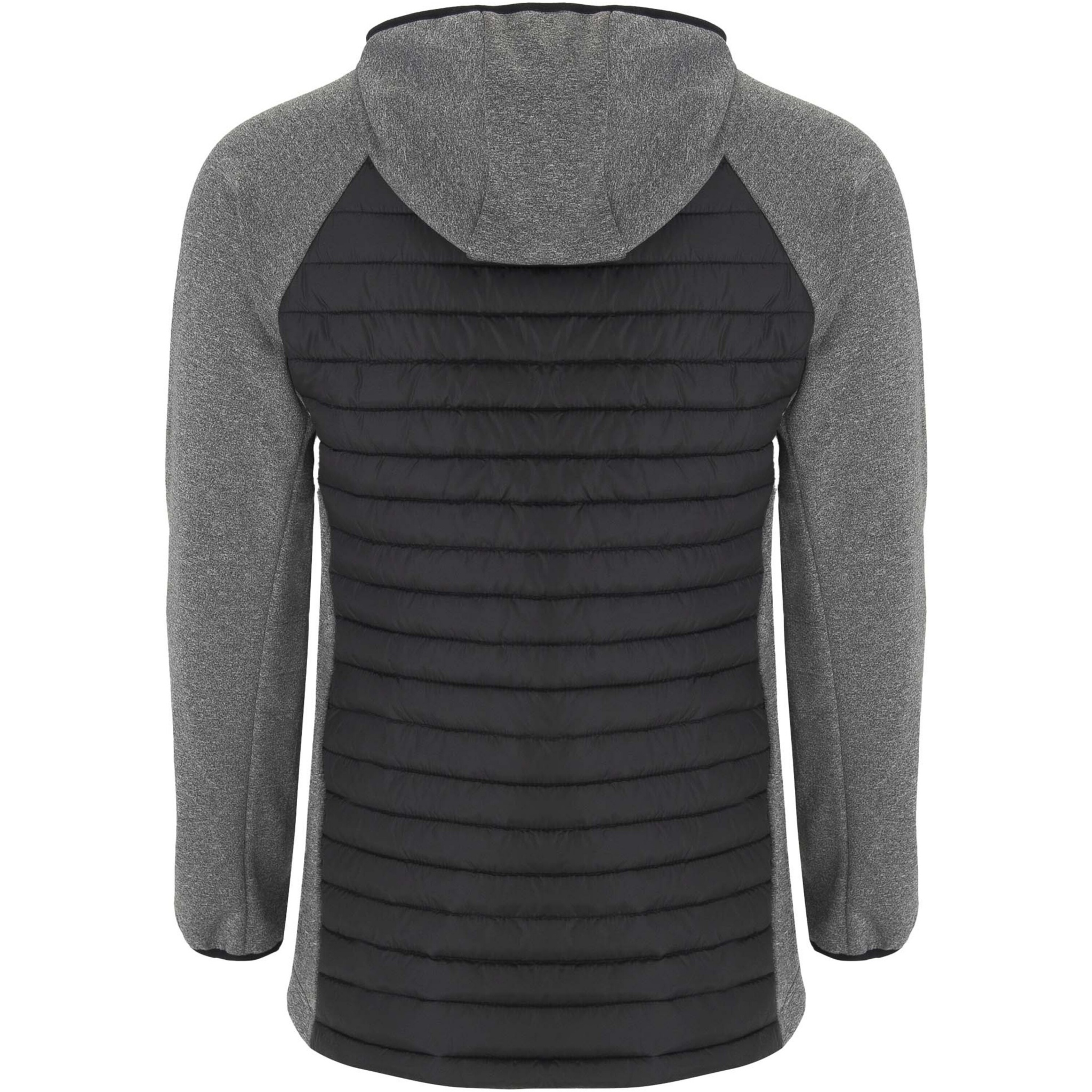 Jacka unisex i två tyg med justerbar huva och raglanärm. Ärmar, sidodelar och huva i softshelltyg. Quiltat tyg med dunkänsla fram och bak. Omvänd dragkedja med matchande hakskydd och löpare. Två framfickor med dragkedjor. Matchande elastisk kant i krage, ärmslut och fåll. Borttagbar etikett. Vindtät modell. Den manliga modellen är 184 cm och bär storlek L, den kvinnliga modellen är 179 cm och bär storlek S.