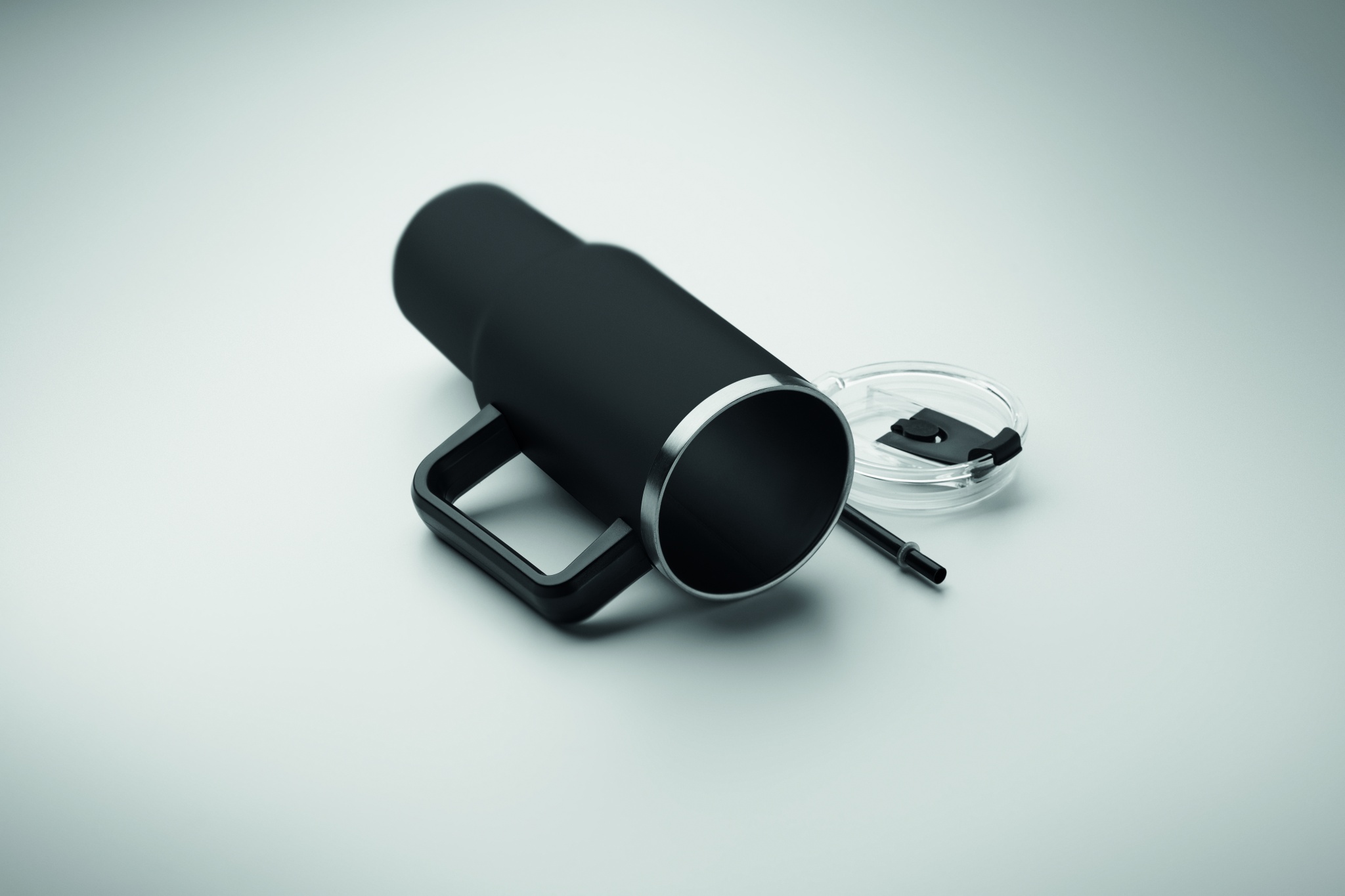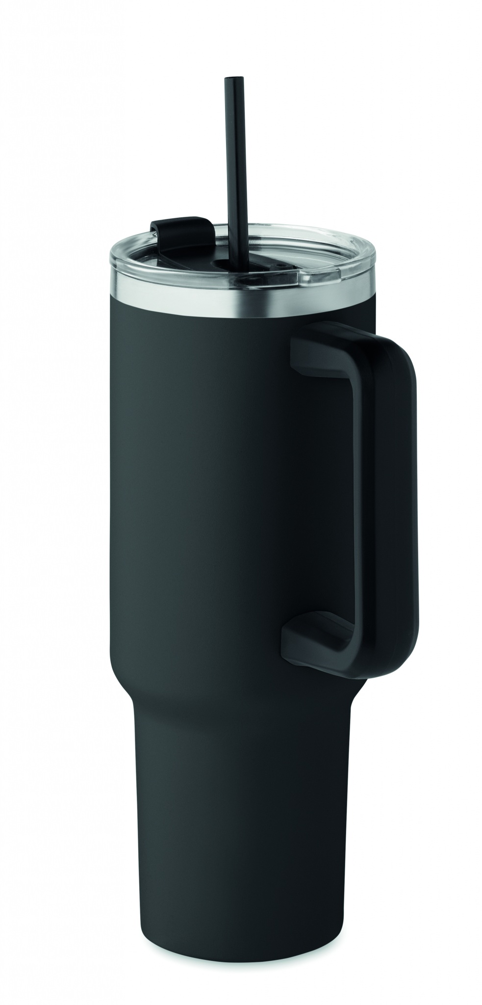 Mugg med dubbelvägg av återvunnet i rostfritt stål med lock med sugrör i PE. Kapacitet 1200 ml. (90% återvunnet rostfritt stål och 10% rostfritt stål).