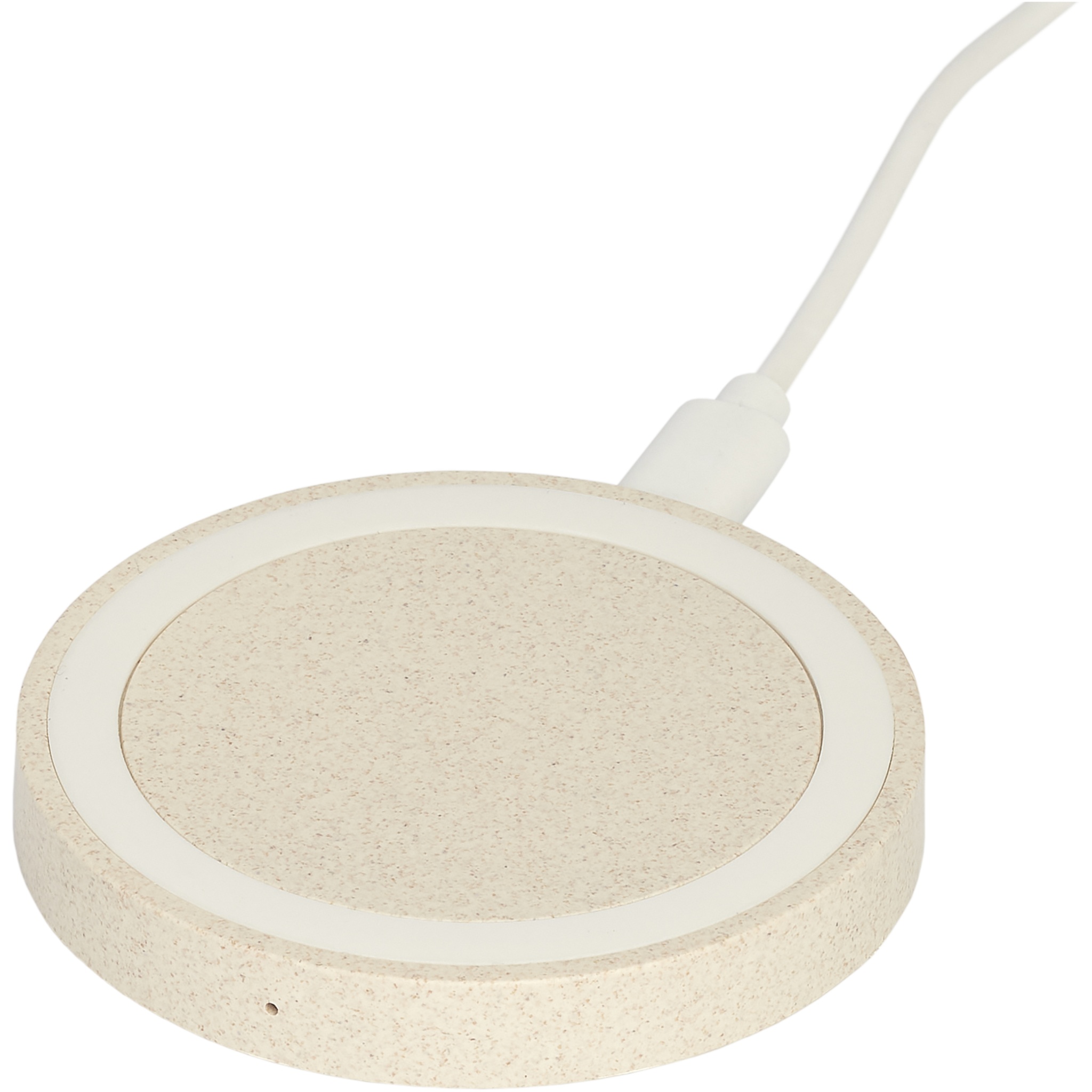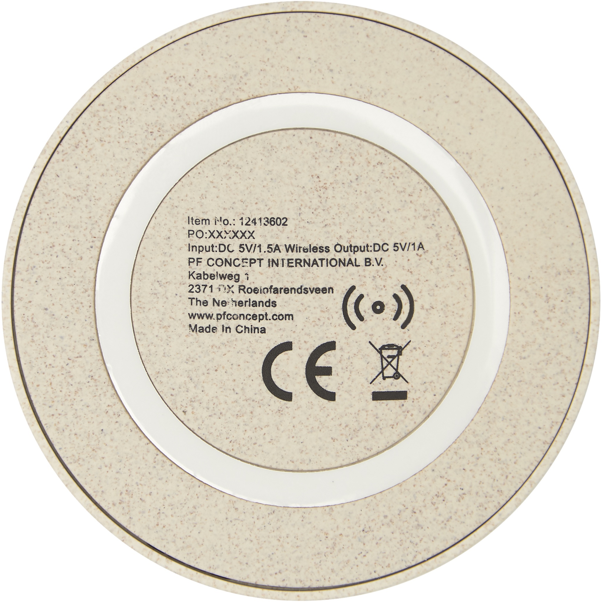 5 w trådlös laddningsplatta gjord av halm och plastmaterial blandat, vilket minskar mängden plast som behövs. För att ladda en enhet trådlöst krävs en extern trådlös laddningsmottagare eller laddningsskal. Förpackad i en presentförpackning och levereras med en bruksanvisning (båda tillverkade av hållbart material). Type-C laddningskabel medföljer.