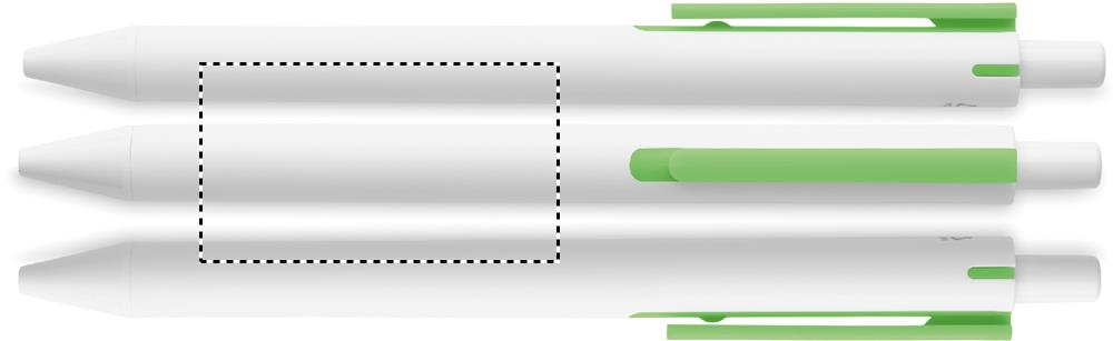 Kulspetspenna med tryckknapp i återvunnen ABS. Vit kropp med kontrastfärg på klips, Blått bläck.