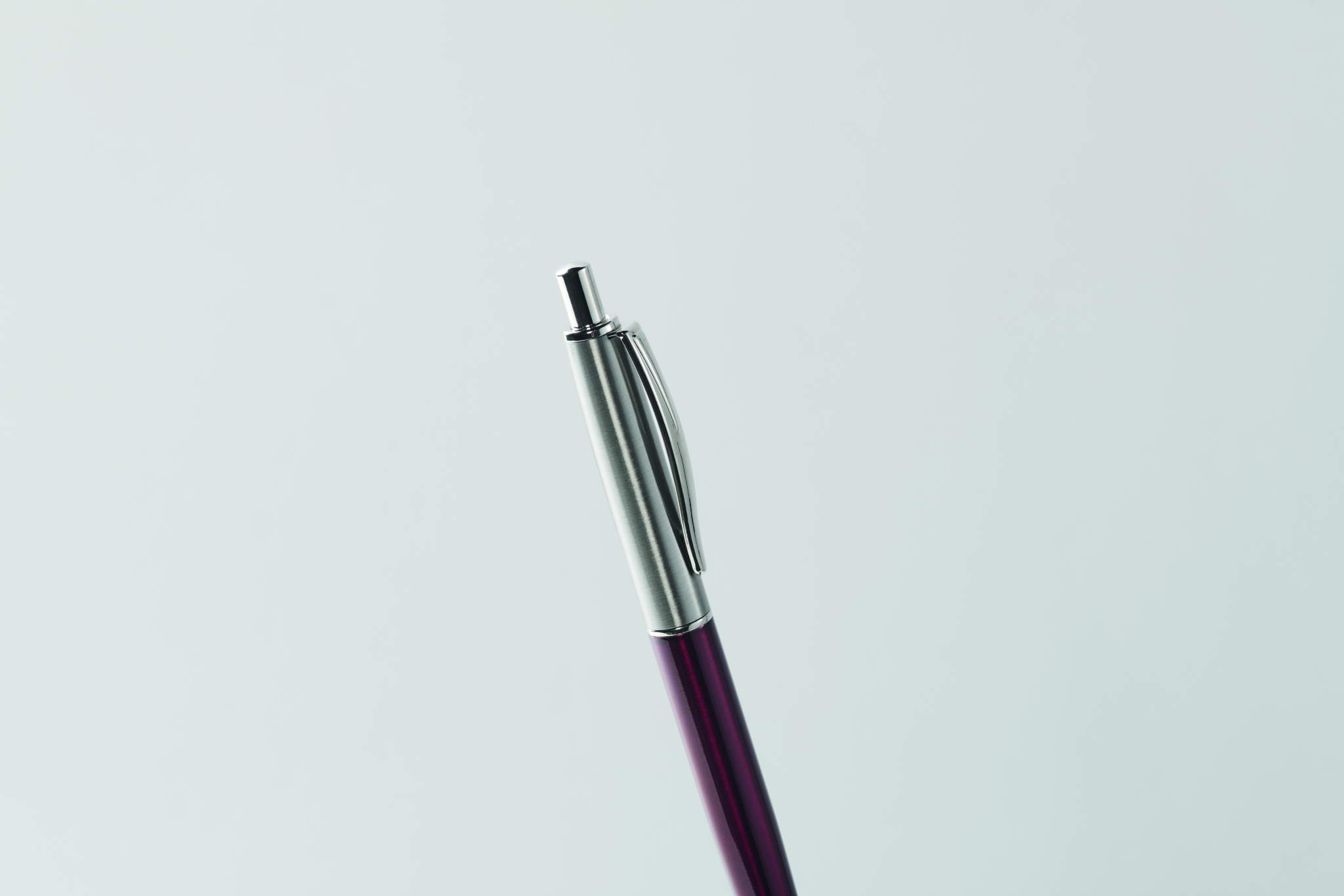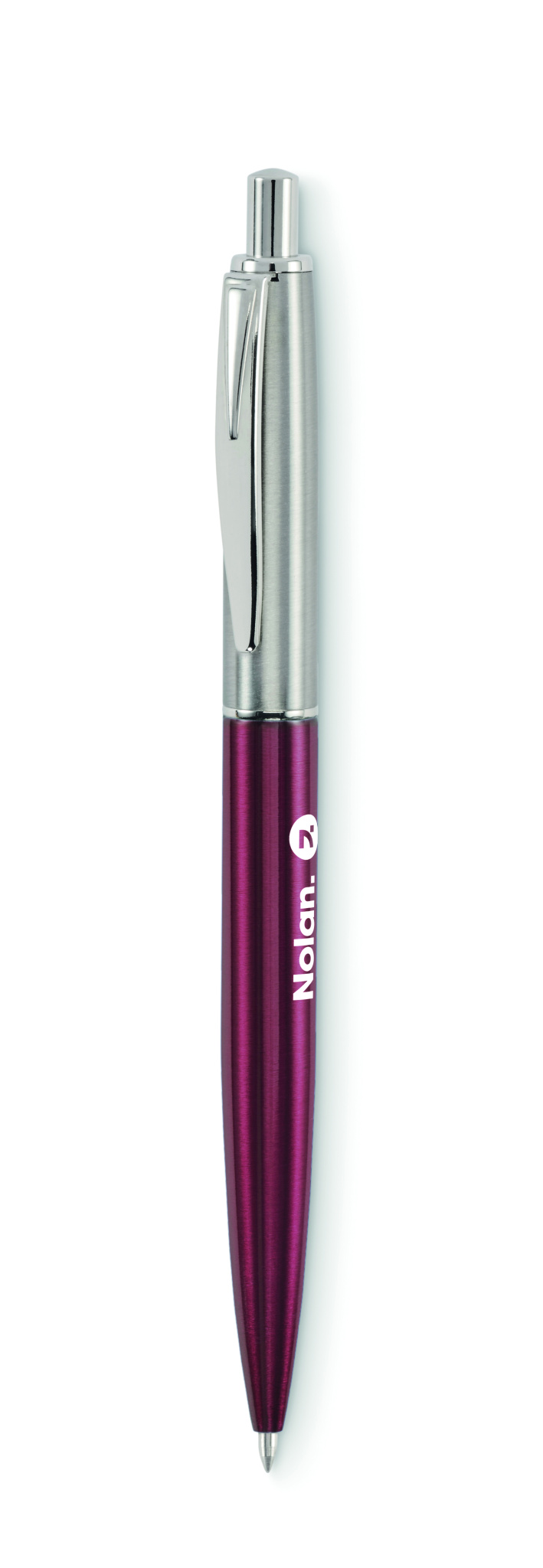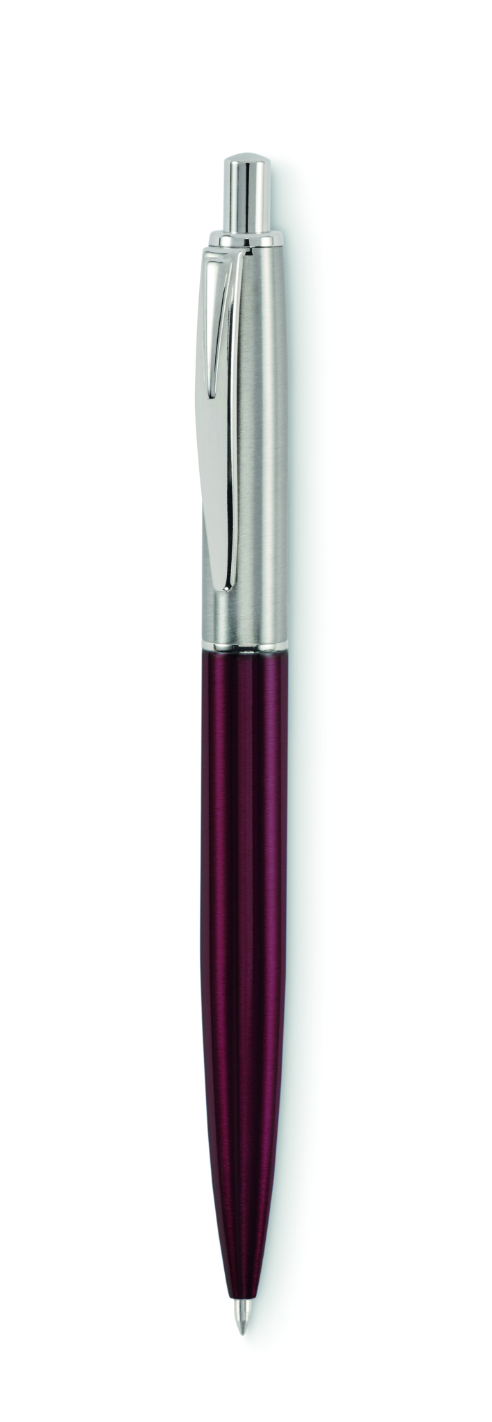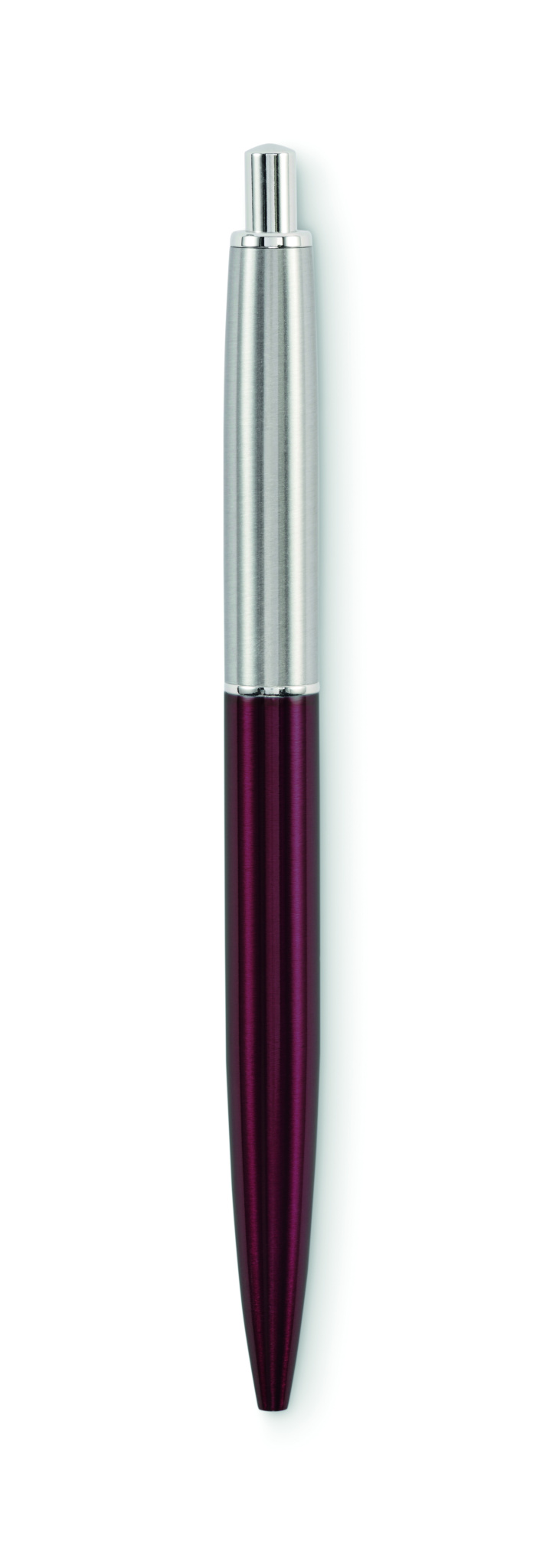 Kulspetspenna med tryckknapp och skaft i återvunnet rostfritt stål. Blått bläck. Levereras i svart låda.