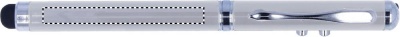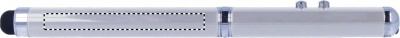 Multifunktionell kulspetspenna i silver metall. Blått bläck refill, vitt LED ljus, röd laserpekare, touch tip för touchscreens. ABS och svart gummigrepp. Blått bläck refill, LED vitt ljus och röd laserpekare. Inkl. 3 knappcellsbatterier. Metall box.