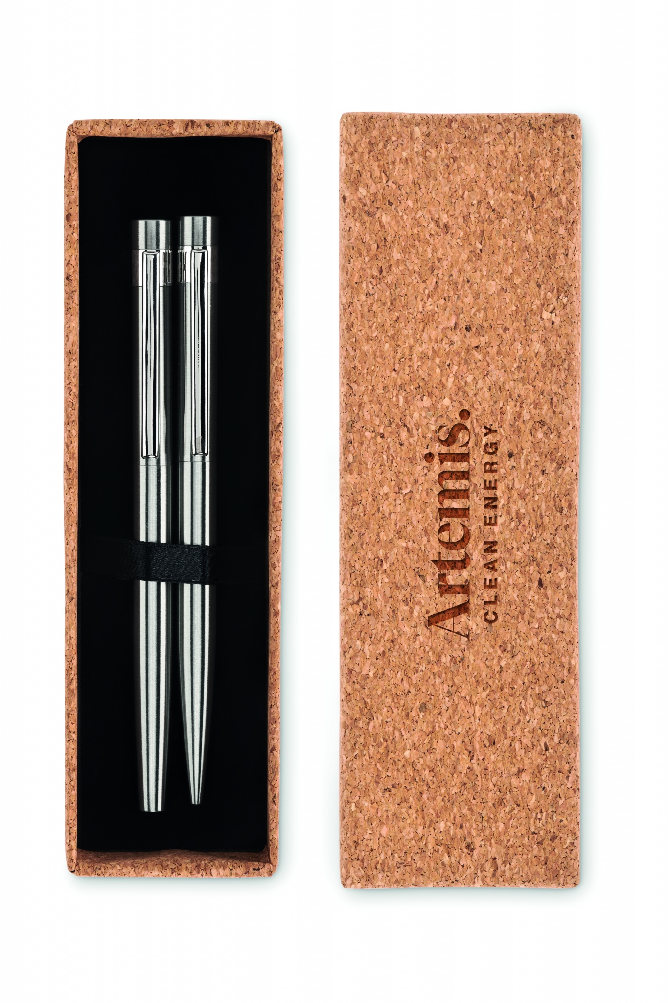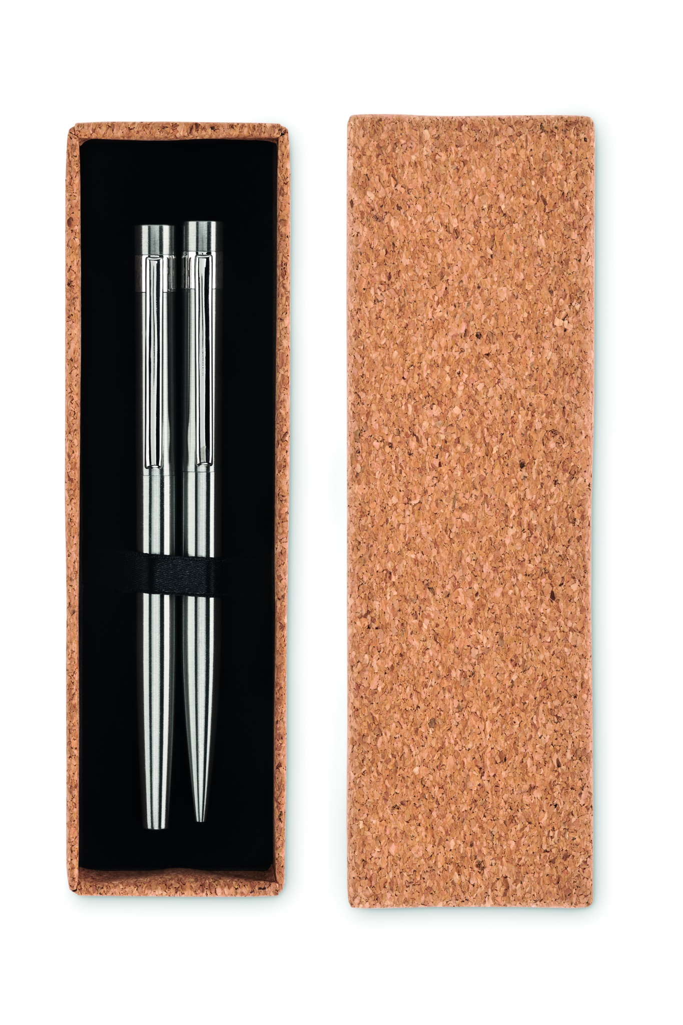 Pennset i återvunnet rostfritt stål med kulspetspenna och rollerball penna. Presenteras i en matchande korkask. Blått respektive svart bläck.
