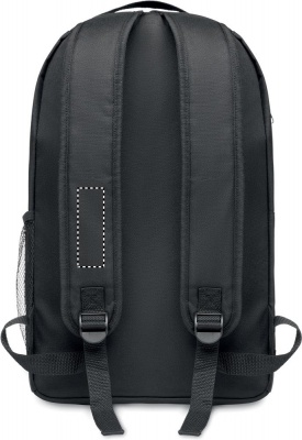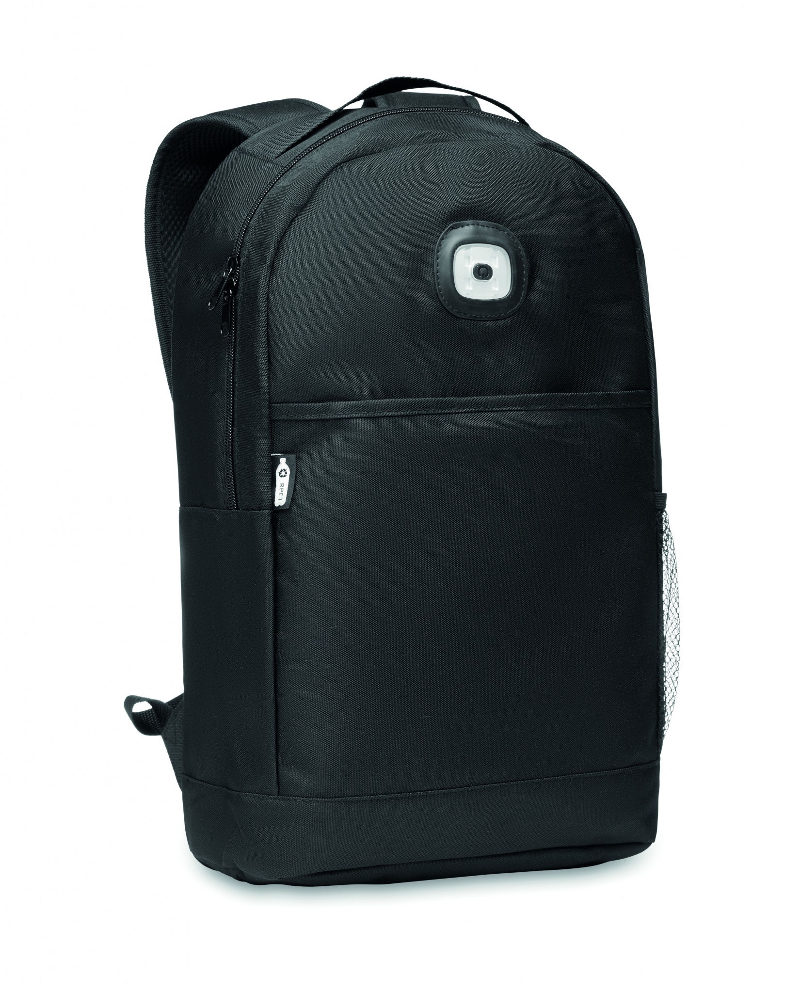 Ryggsäck i 600D RPET, framficka med kardborrstängning, nätficka på sidan och COB-ljus på frontpanelen som kan tas av. Har fast eller blinkande sken. COB-lampa med vitt ljus med tre olika ljusinställningar. Knappcellsbatteri ingår. Mått: 28x34x13cm, Volym ca 12,5L