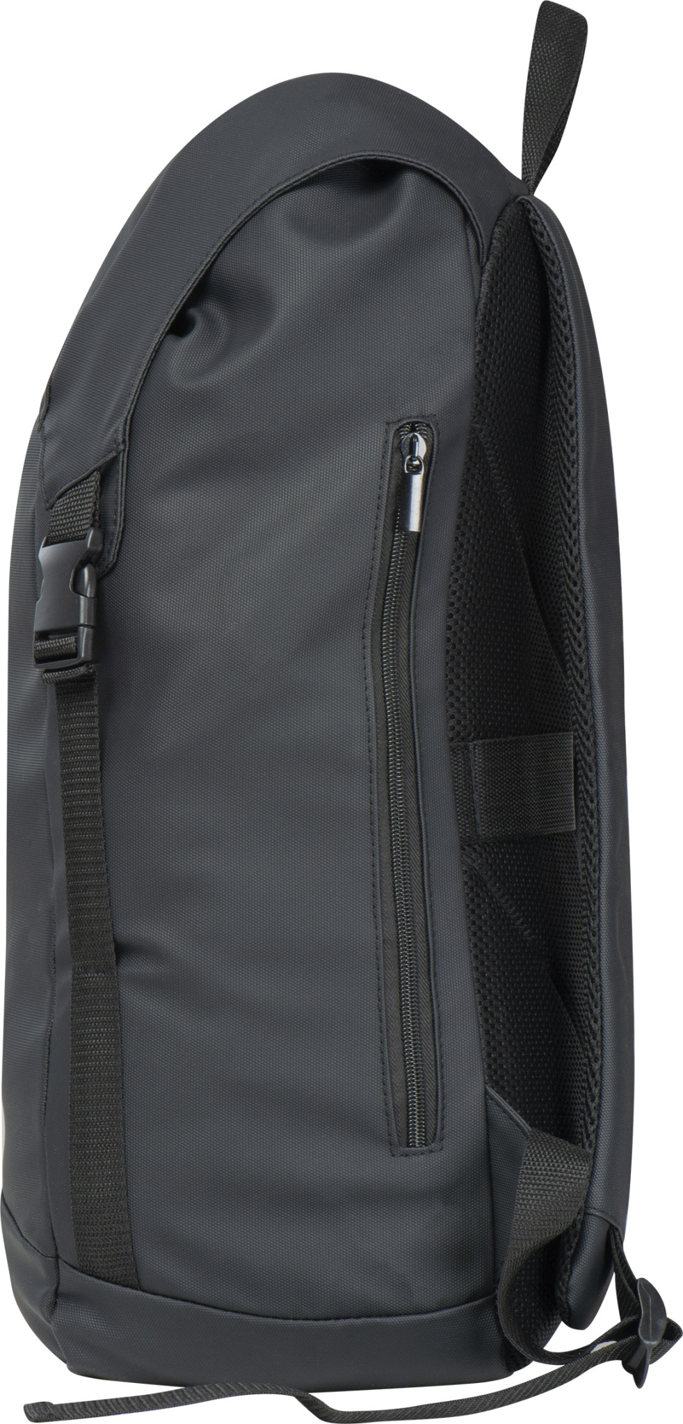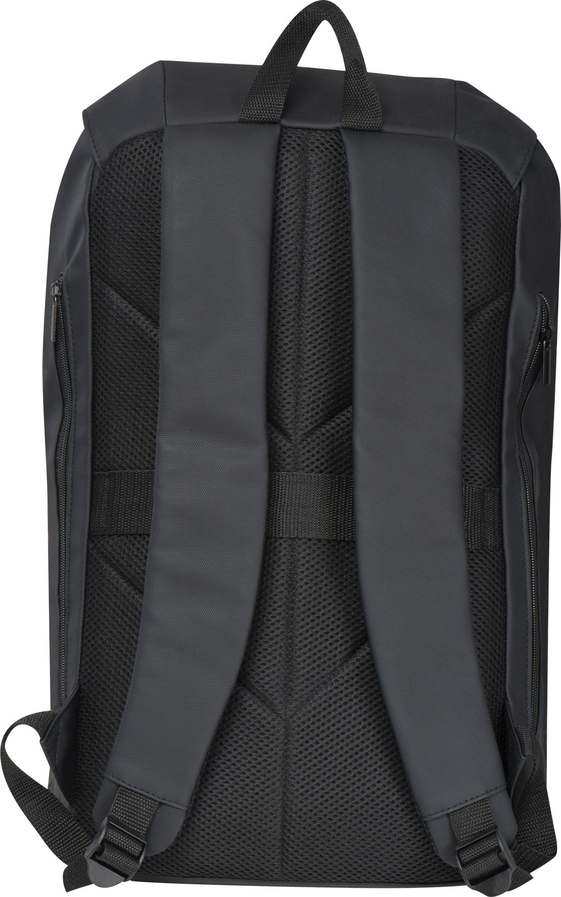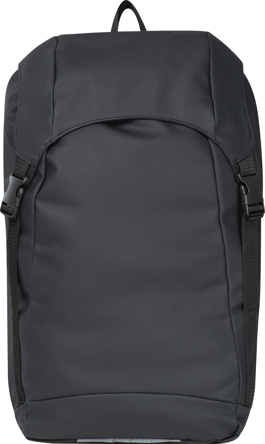 Stor polyesterryggsäck med vattenavvisande PU-beläggning. Den har ett rymligt huvudfack med en laptopfodral och vadderad rygg, samt två fickor med dragkedjor på höger och vänster utsida. Den innehåller en dragsko och en flik som håller innehållet torrt under regn.