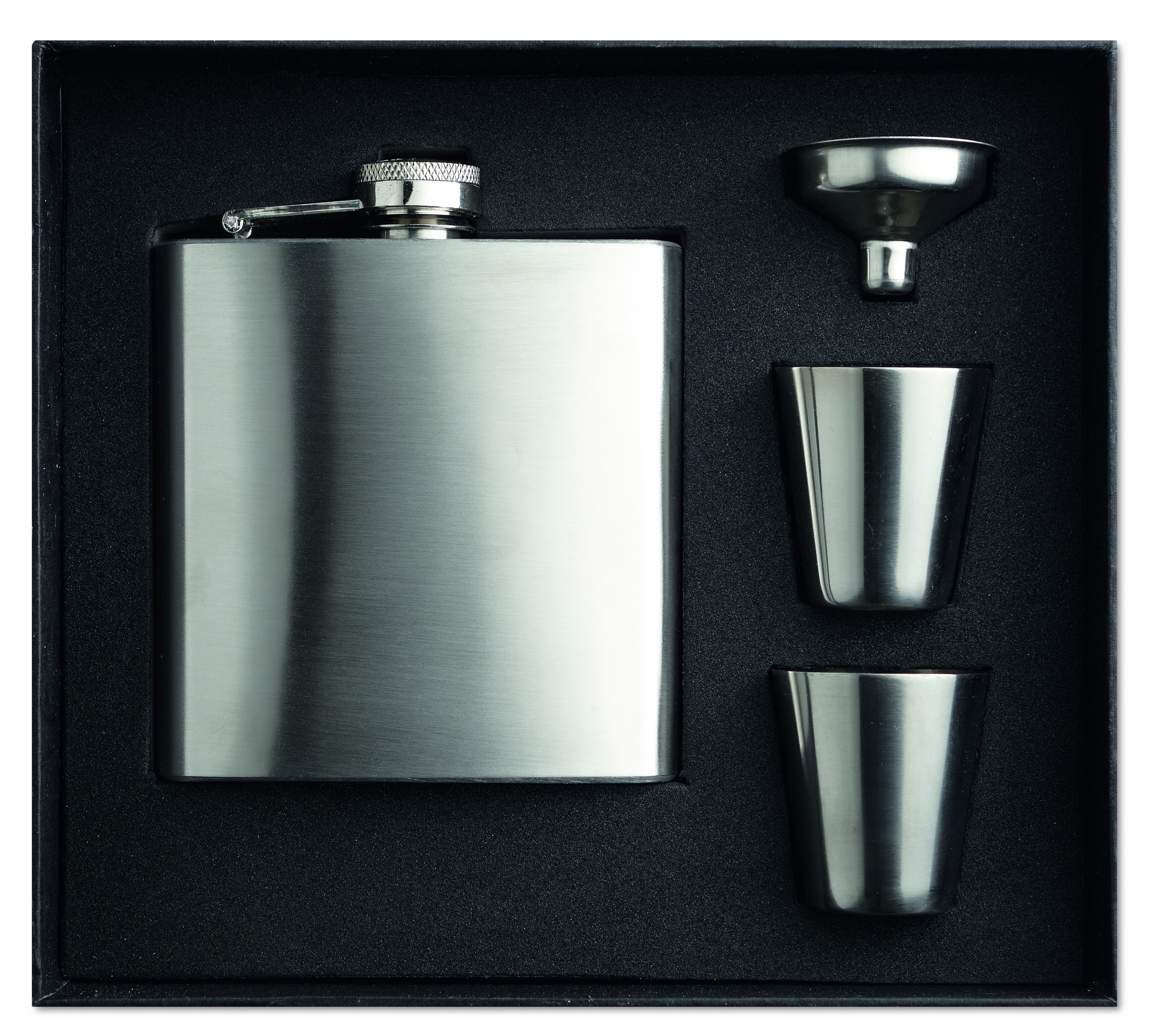 Fickplunta i metall med satin finish som rymmer 175 ml. Enkelvägg. 2 huttkoppar och en tratt ingår. Setet levereras i en fin presentask.