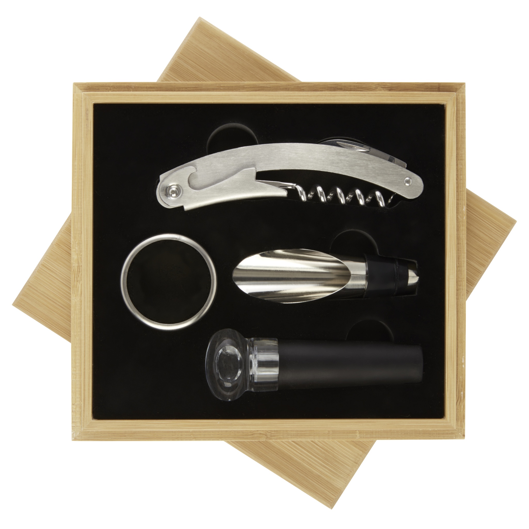 Vinset i 4 delar inklusive en servitriskorkskruv, en propp, en hällare och en ring. Levereras i en presentförpackning av bambu och produceras enligt hållbara standarder.