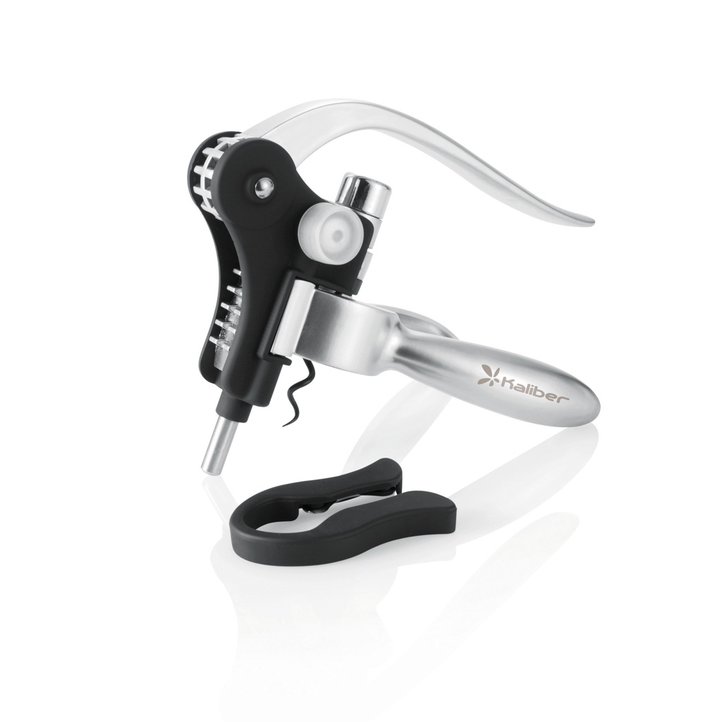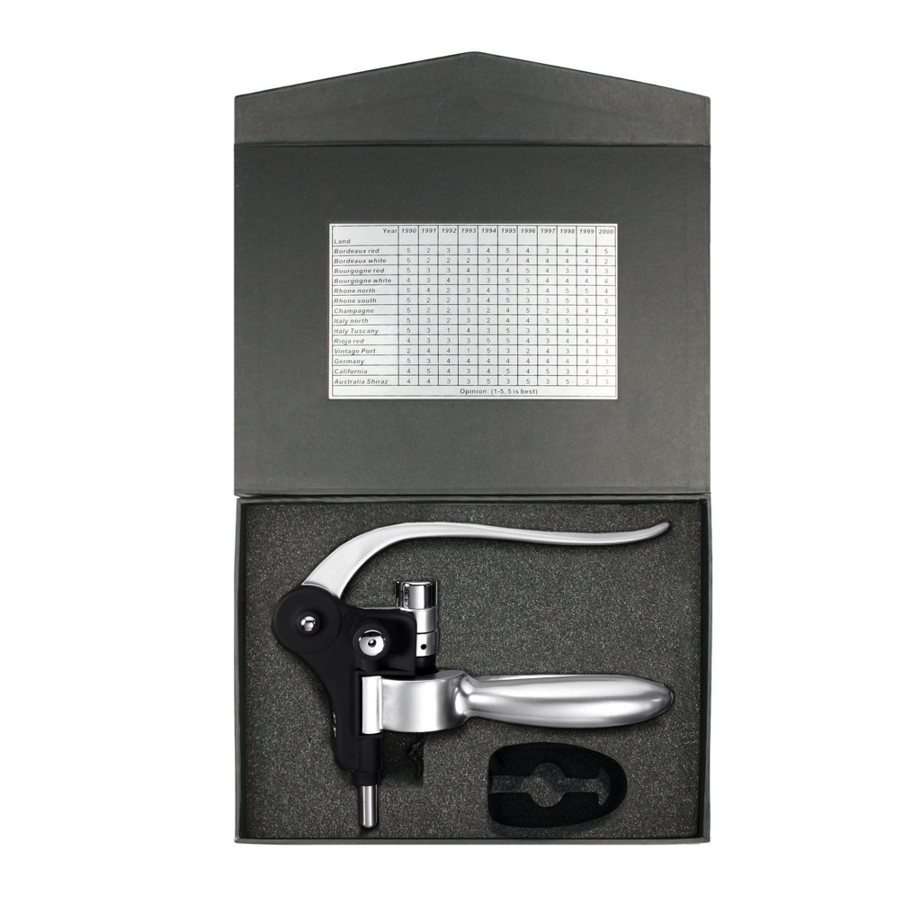 Stilren vinöppnare med smart mekanism som underlättar öppnandet. Teflonklädd spiral inklusive folieskärare samt vinguide.